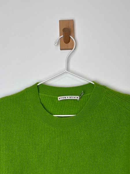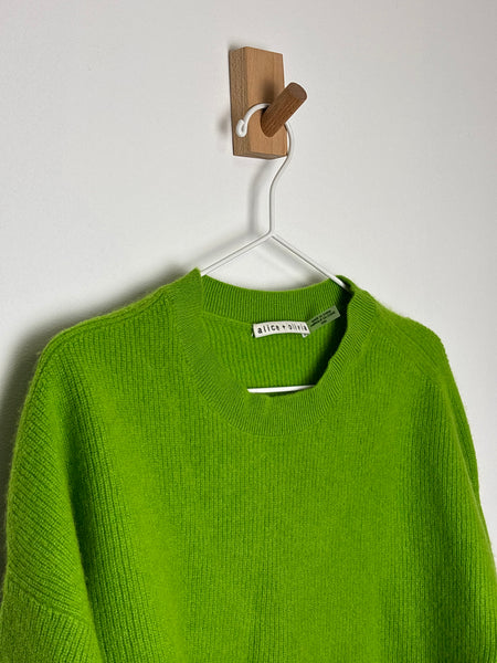 Make a bold statement with this vibrant neon lime jumper from Alice + Olivia. Made almost entirely of pure cashmere, this "Chara" style offers an incredibly soft hand-feel with a hint of stretch for the perfect fit. The dropped shoulders and relaxed cut give it a modern, effortless edge.