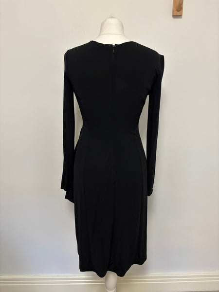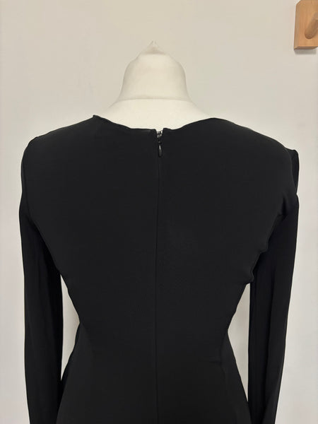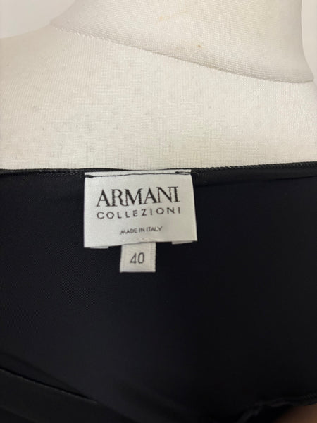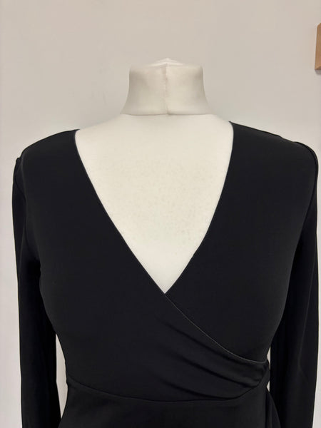 Armani Collezioni dress, made from a soft, fluid fabric. This black mid length dress features a classic wrap-style front with a flattering V-neckline. The long sleeves and beautifully draped skirt add a sophisticated touch, making it perfect for a chic evening event or a professional setting.