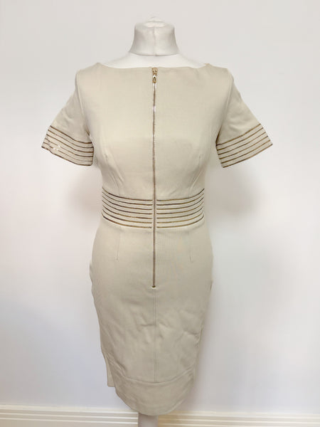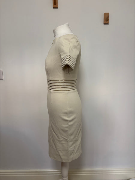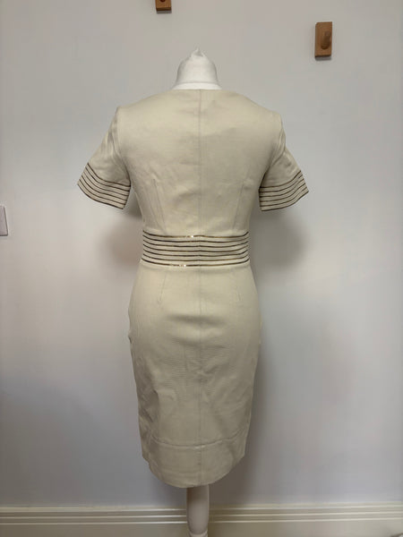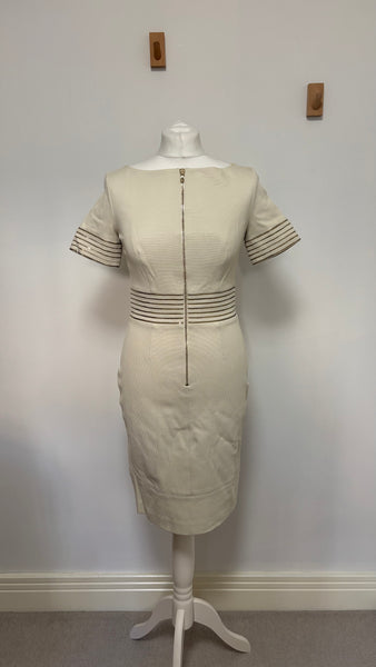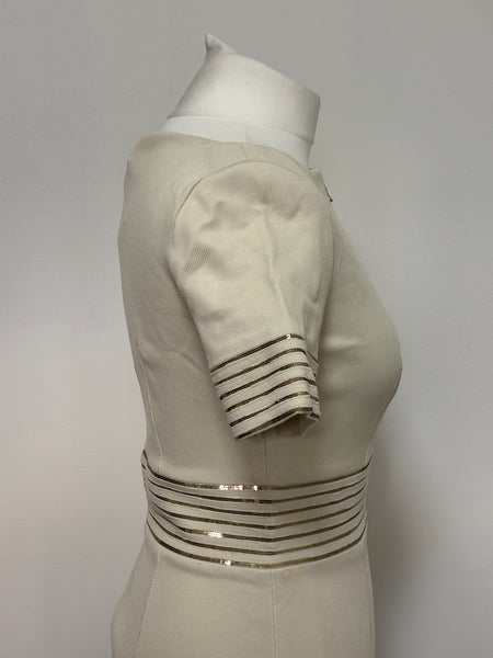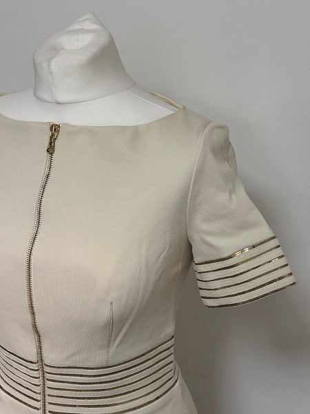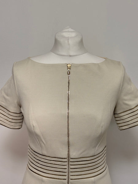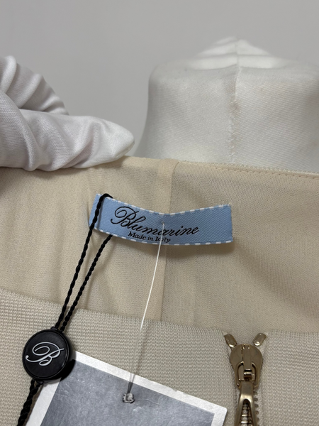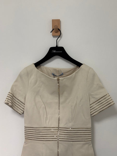 This elegant Blumarine beige dress features a structured yet feminine shape, highlighted by metallic striped detailing at the waist and sleeves. The discreet front zip closure adds a modern touch while maintaining the brand’s signature refined aesthetic. A versatile and timeless piece perfect for elevated daytime looks or understated evening style.