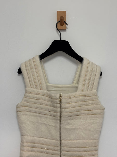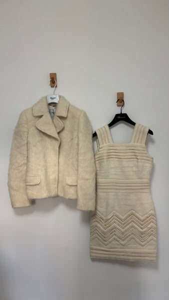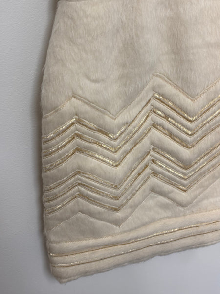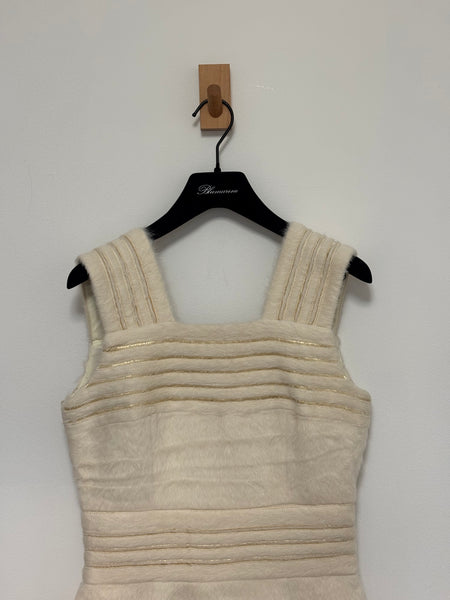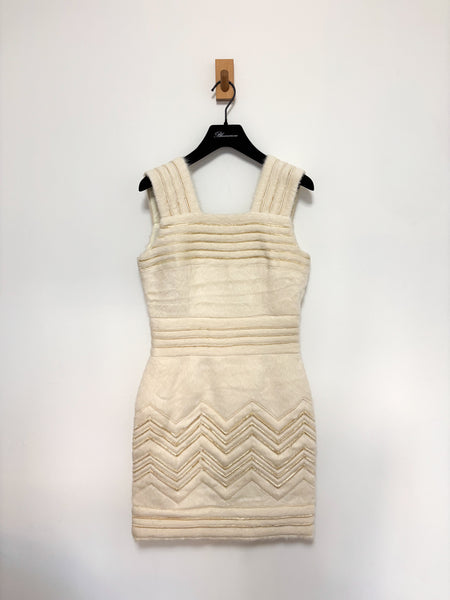 Chic and structured, this cream mini dress from Blugirl by Blumarine is crafted with a soft textured fabric featuring wide straps, horizontal paneling at the bodice, and intricate chevron embroidery along the skirt. Feminine yet modern, it’s a flattering silhouette that works beautifully for both daytime sophistication and evening elegance.