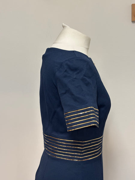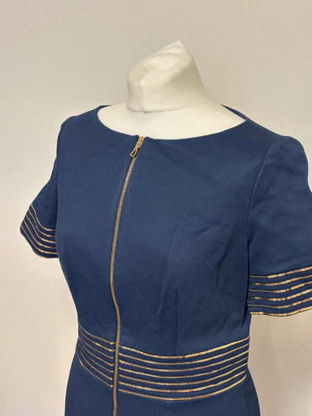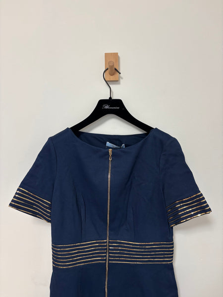 A chic Blumarine navy dress designed with short sleeves and a flattering tailored cut. Decorative metallic striping at the waist and sleeve cuffs adds a touch of shine, beautifully enhancing the clean silhouette. Finished with a full-length front zip that gives the dress a contemporary, polished finish—ideal for work events or sophisticated daytime wear.