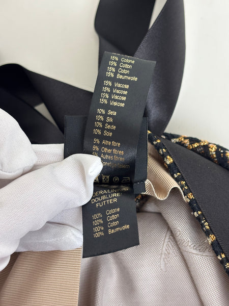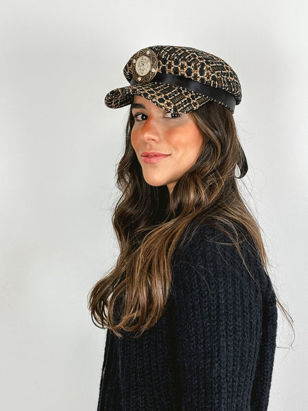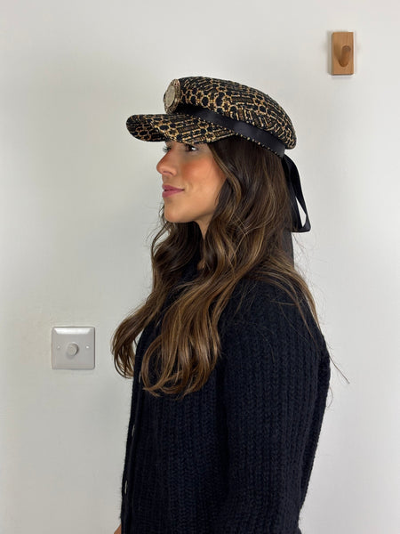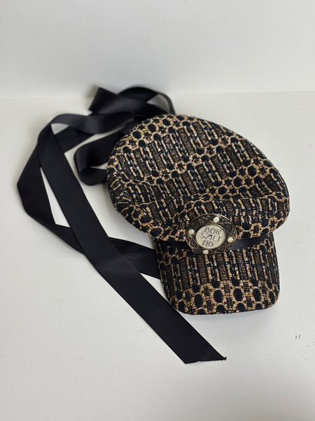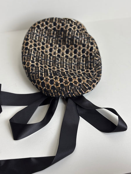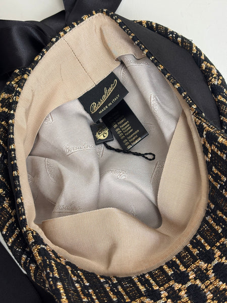 A stunning blend of heritage craftsmanship and contemporary flair, this Borsalino baker boy hat is a standout accessory. Made in Italy from a textured tweed, it features a structured peak, a tonal black grosgrain ribbon with a trailing bow at the back, and a magnificent, oversized jewelled brooch on the front. This piece perfectly marries the brand’s legendary hat-making tradition with a bold, glamorous edge, making it an essential for any high-fashion curated collection.