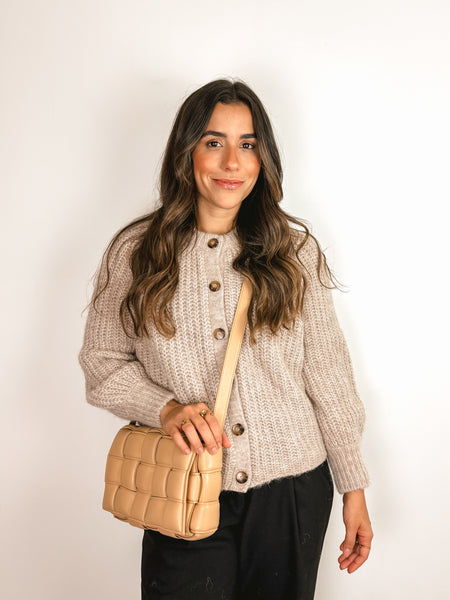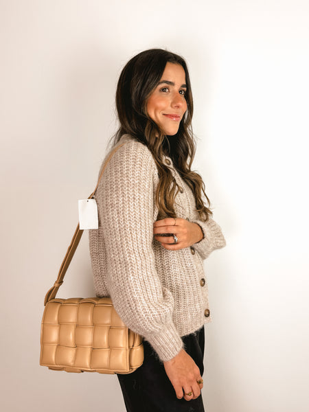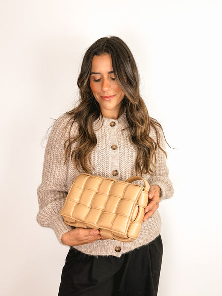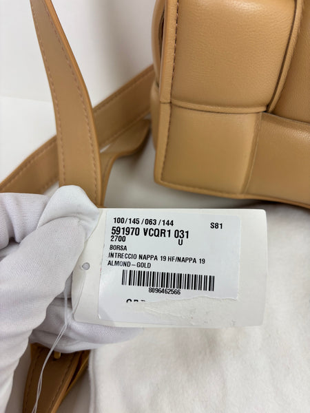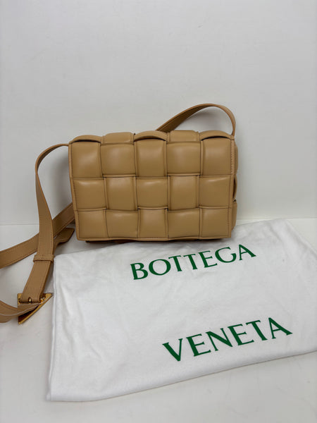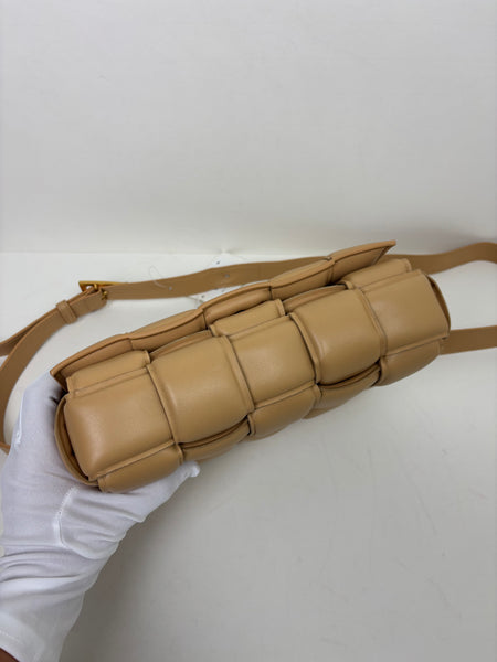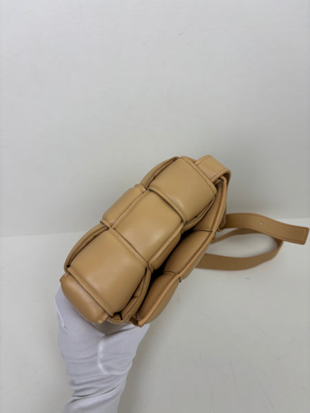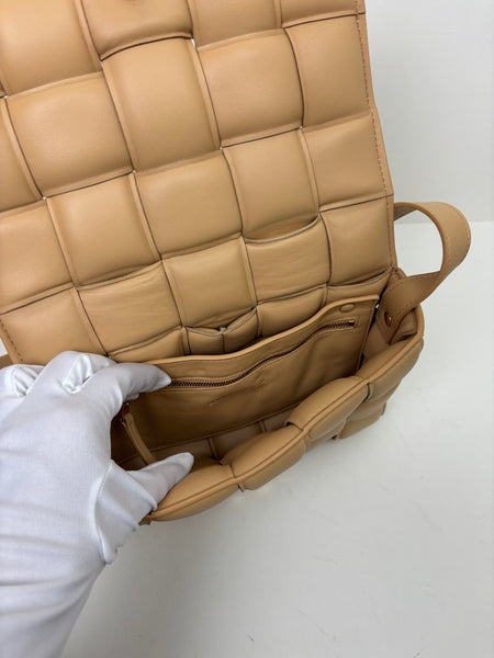 Bottega Veneta Padded Cassette Bag in a timeless Caramel/Tan hue. Crafted from soft padded lambskin, it showcases the brand’s signature maxi-Intrecciato weave, reimagined with oversized, cloud-like leather strips. The classic size offers a structured yet plush silhouette, featuring an adjustable leather strap and a secure flap closure. Spacious for daily essentials, it transitions effortlessly from day to night—making it a versatile statement piece.