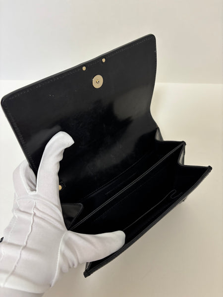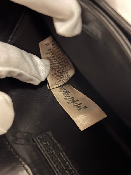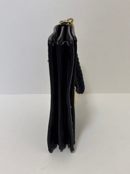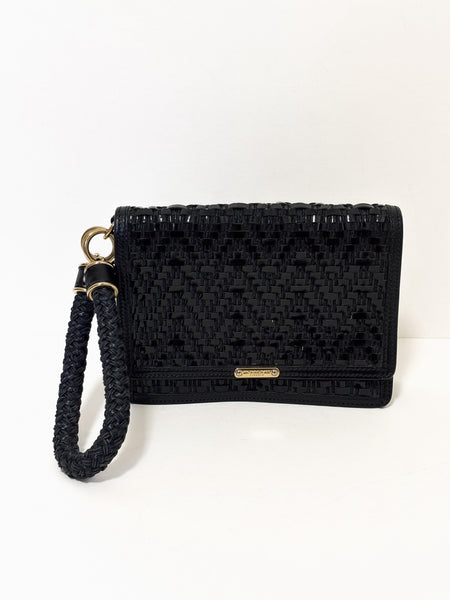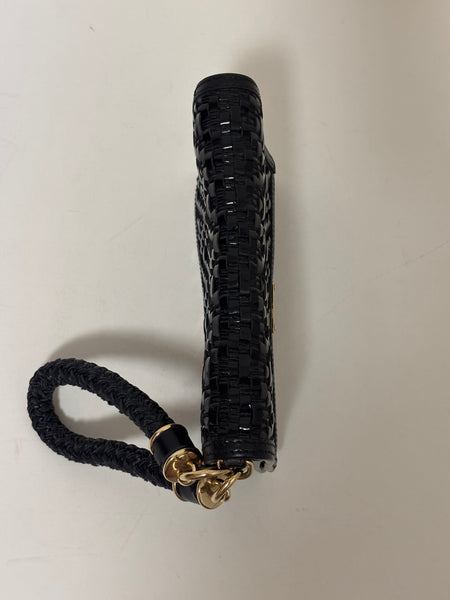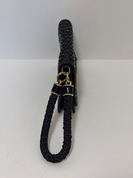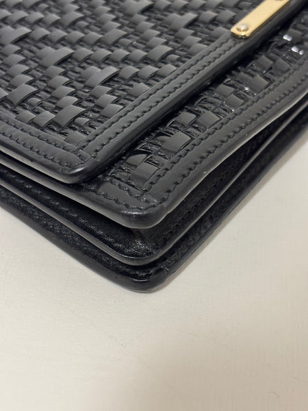This sleek black clutch by Burberry is the perfect accessory for a night out. Crafted from patent leather, the bag features a distinctive all-over woven texture that adds a touch of modern sophistication. The clutch is secured with a small gold-tone plaque and has a chunky, woven wristlet strap for easy carrying. Its compact size and eye-catching texture make it a versatile addition to any evening ensemble.