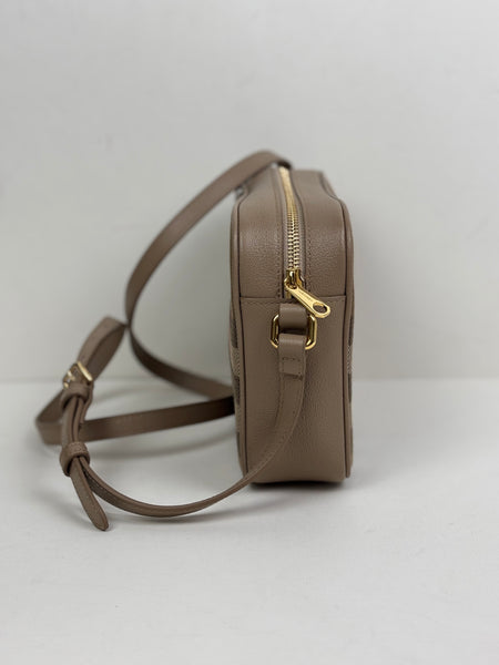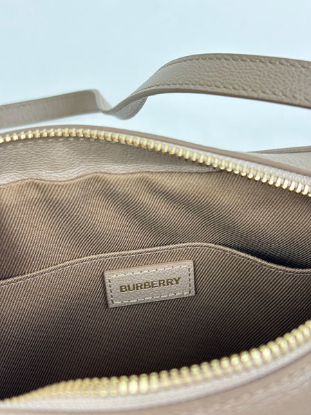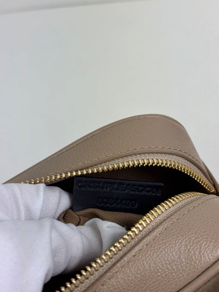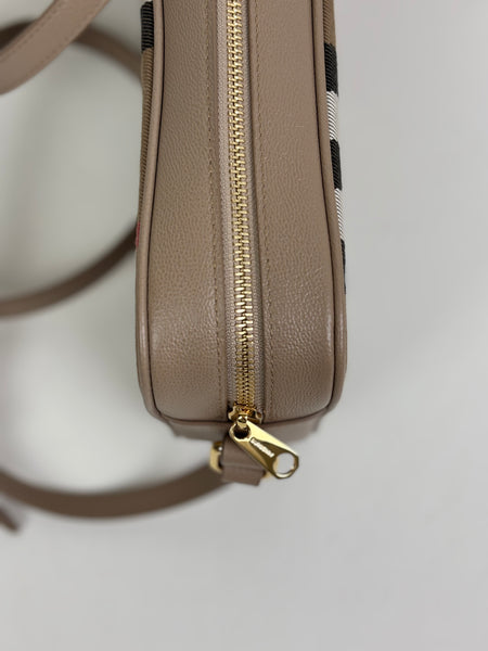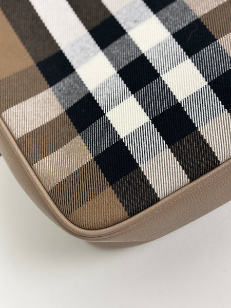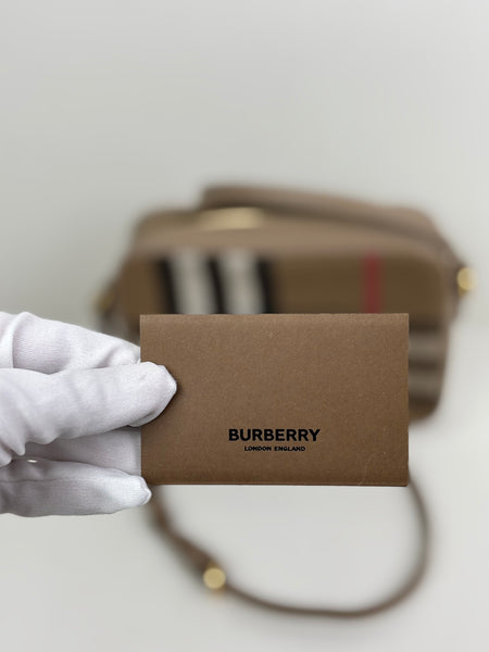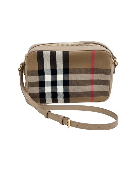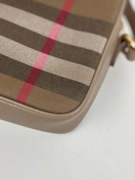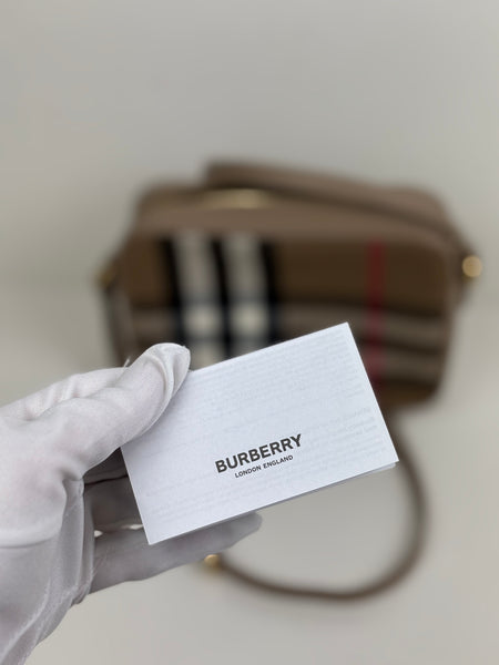 A contemporary staple, this compact camera bag showcases the refreshed Burberry oversized check paired with supple Chestnut Beige leather trim and gleaming gold-tone hardware. Its boxy, functional silhouette and adjustable crossbody strap make it an indispensable accessory for the urban minimalist seeking high-impact heritage style.