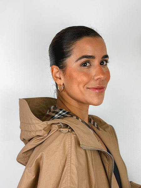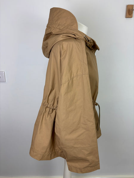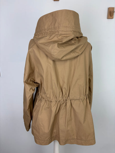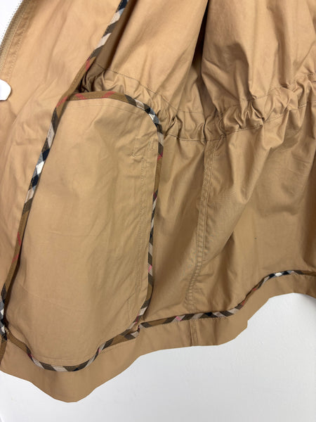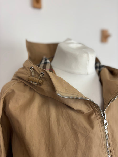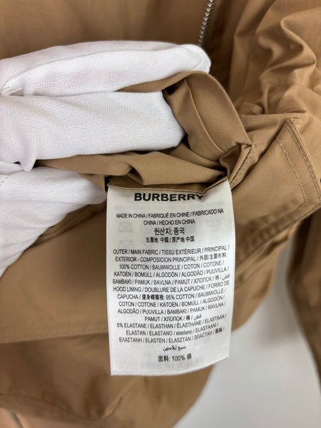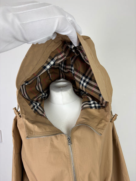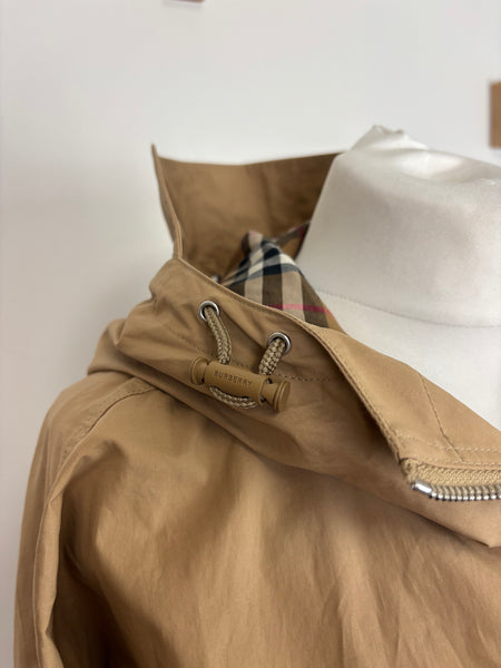 A classic Burberry parka in timeless beige. Crafted from lightweight, water-resistant fabric, it features a drawstring waist for a flattering fit and a full zip closure. The hood reveals the brand’s signature checked lining, adding a touch of heritage detail. A versatile outer layer for effortless everyday style.