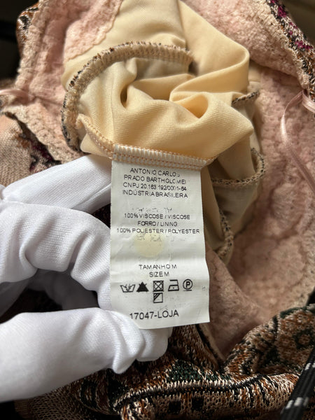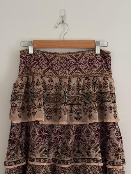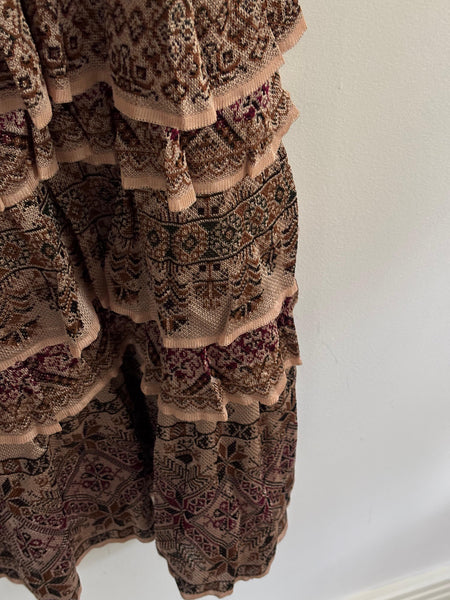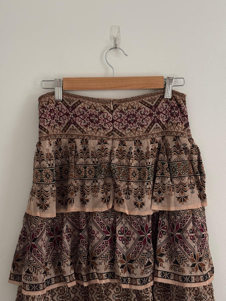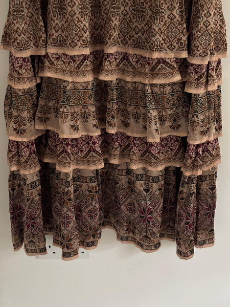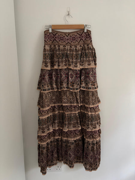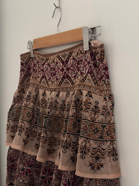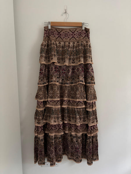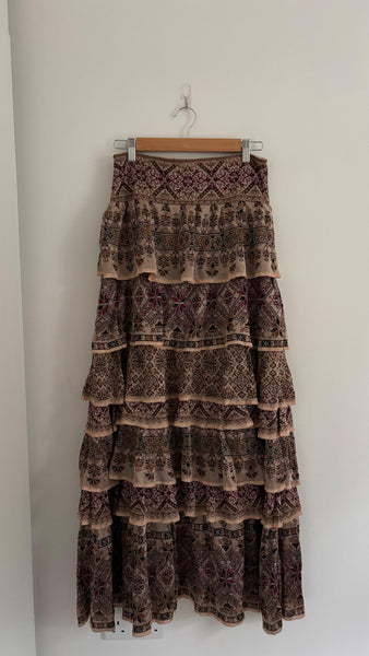 Cecília Prado is a Brazilian designer celebrated for her artisanal knitwear and bohemian touch. This tiered maxi skirt brings earthy tones and intricate patterns in a flowing silhouette. Elegant yet relaxed, it moves beautifully and transitions easily from day to night.