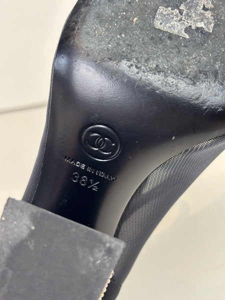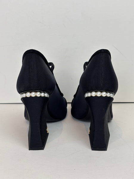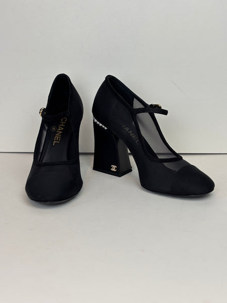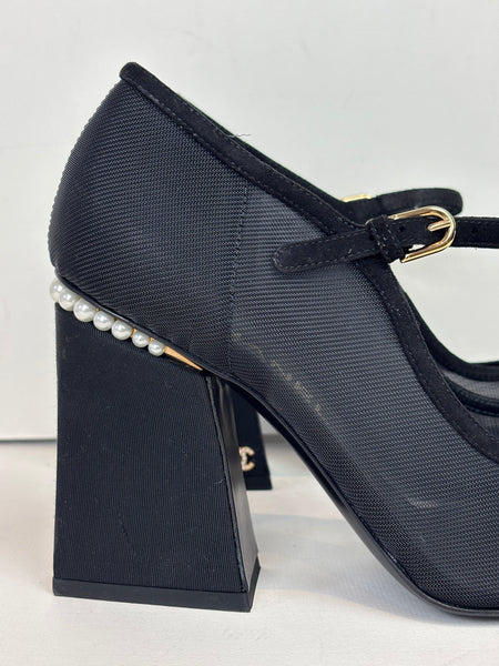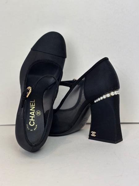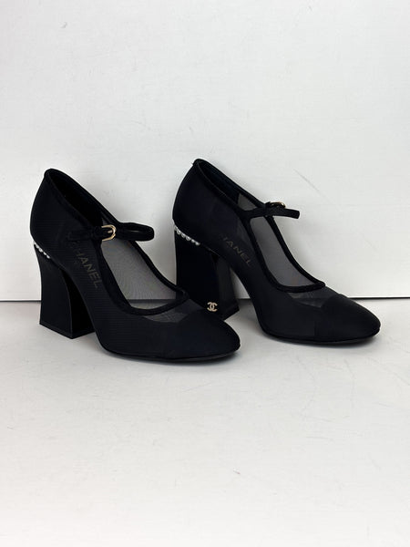 A refined pair of Chanel Mary Jane heels crafted in black mesh and grosgrain. The design features a soft rounded cap toe, delicate strap with gold-tone hardware, and a sculptural block heel adorned with a row of signature Chanel pearls. Elegant, modern, and unmistakably Chanel — the perfect blend of sophistication and comfort.