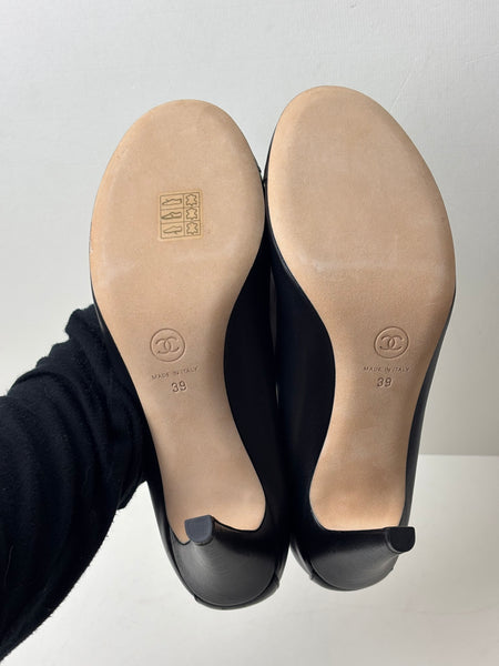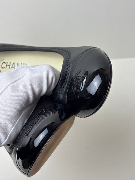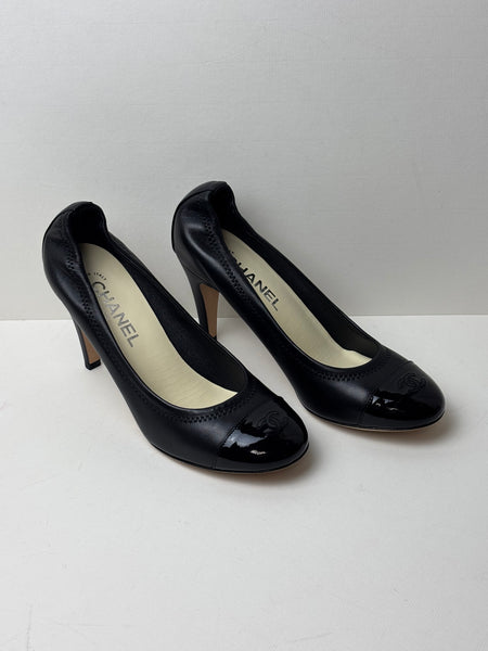 A timeless Parisian chic, these Chanel pumps offer a sleek, streamlined silhouette in premium black leather, accented by a high-shine patent leather toe cap featuring the discreet embossed CC logo. This pair features a clean, minimalist sole, making them perfect for both professional settings and evening elegance.