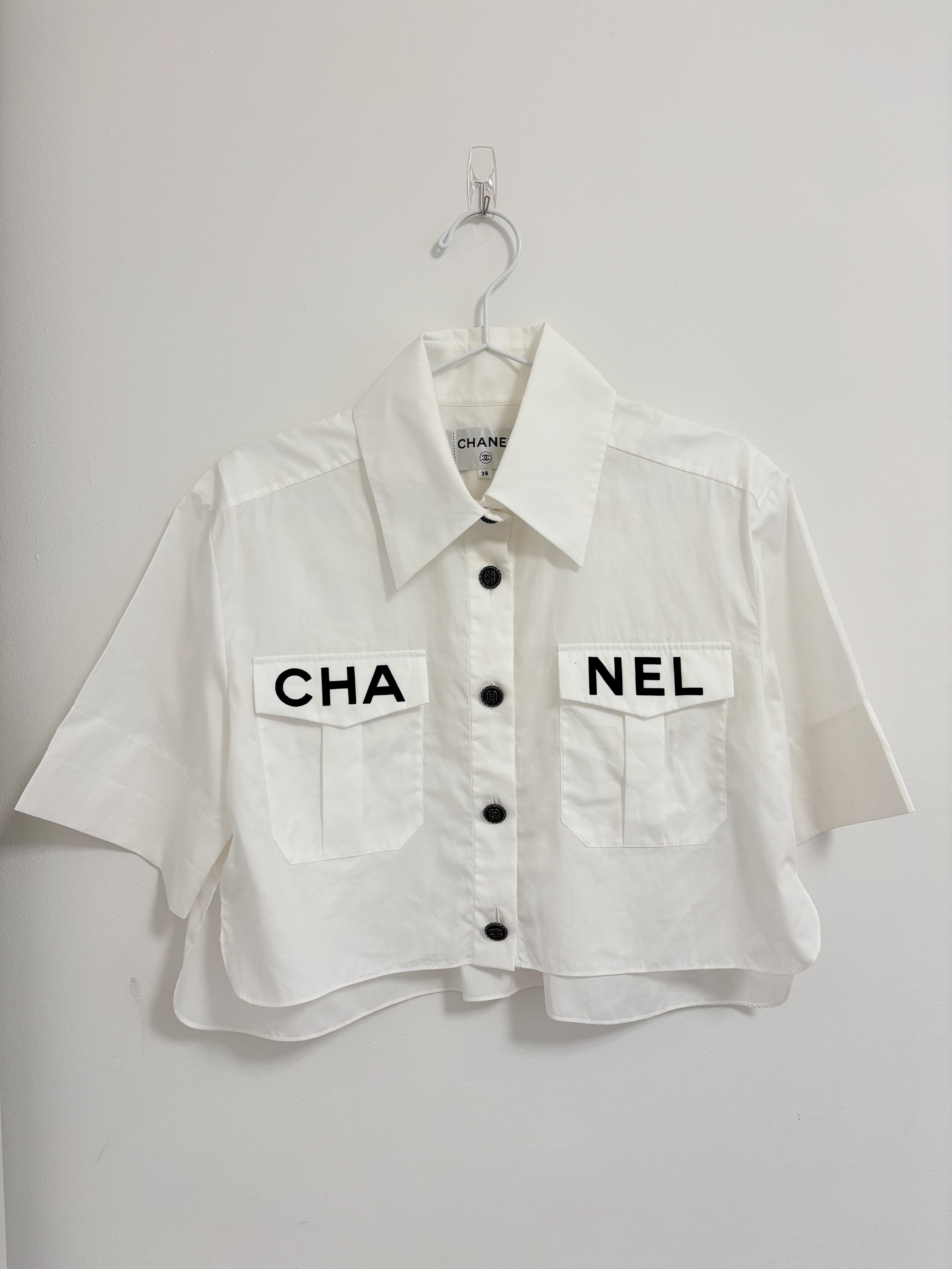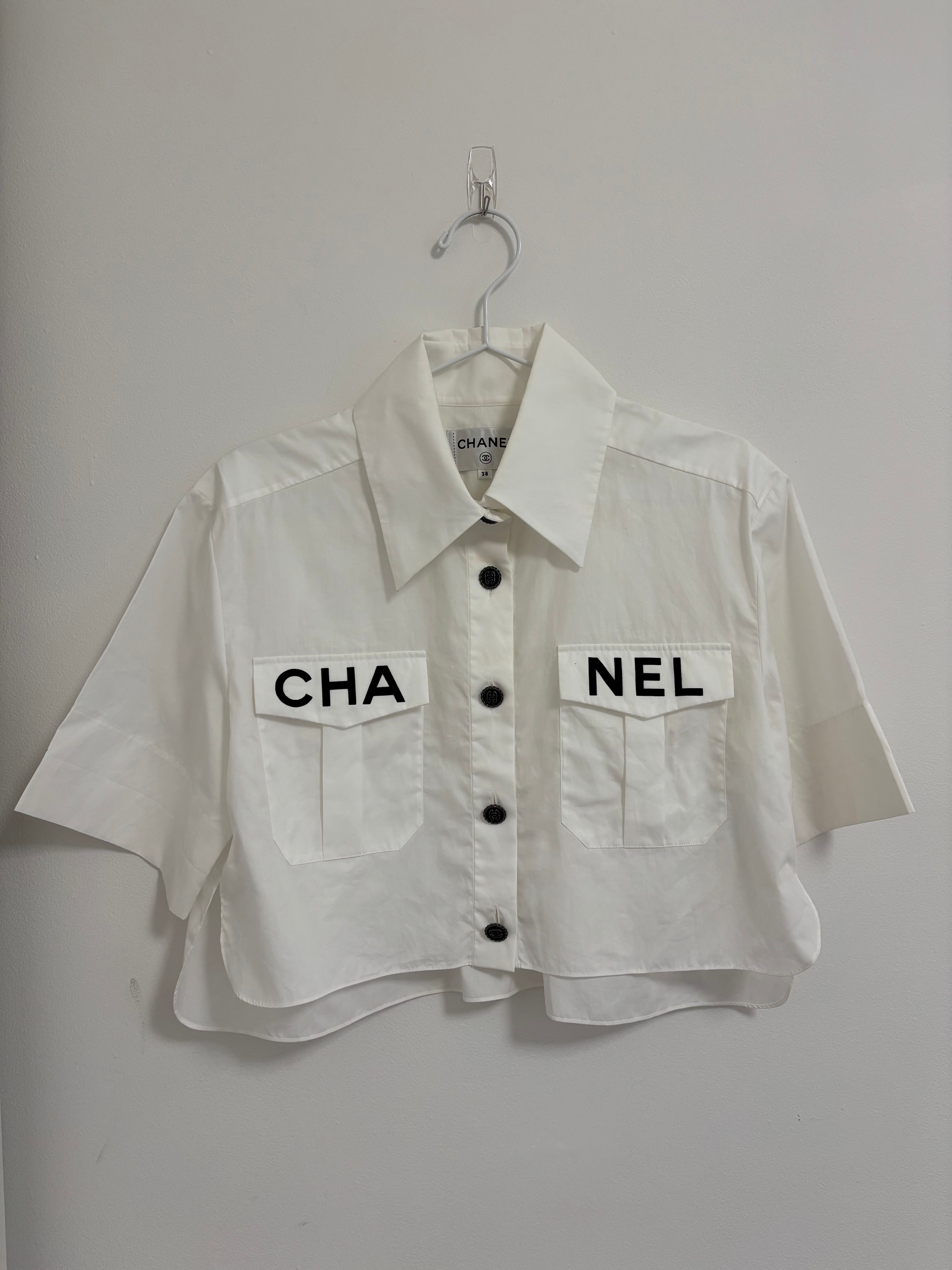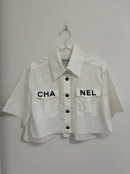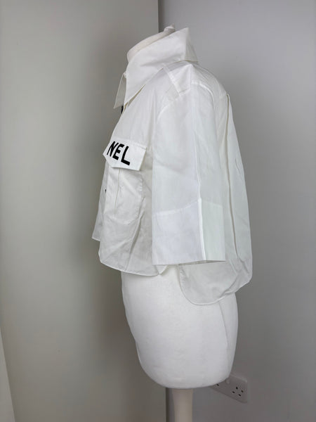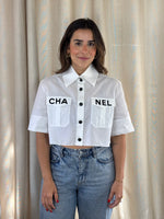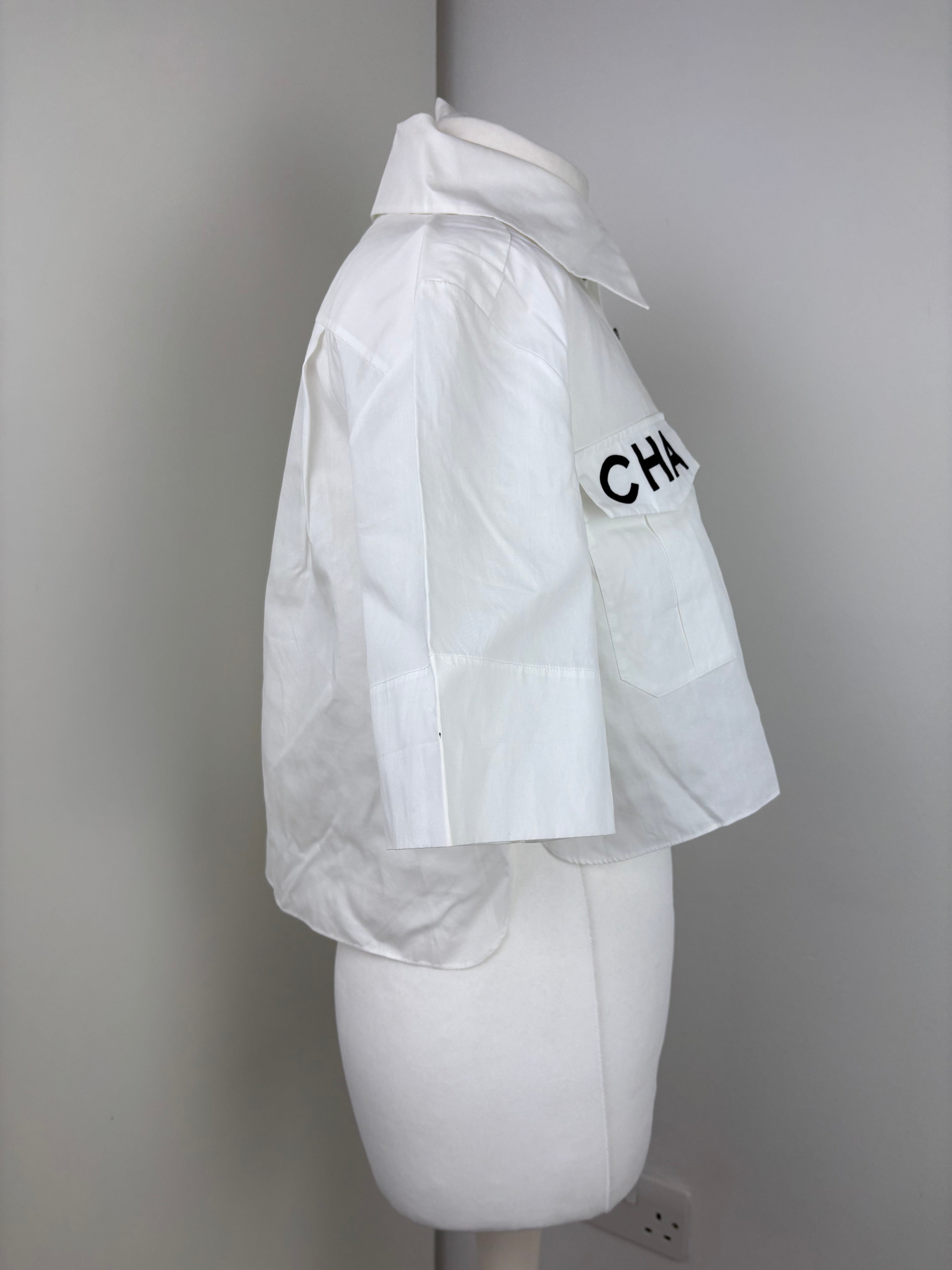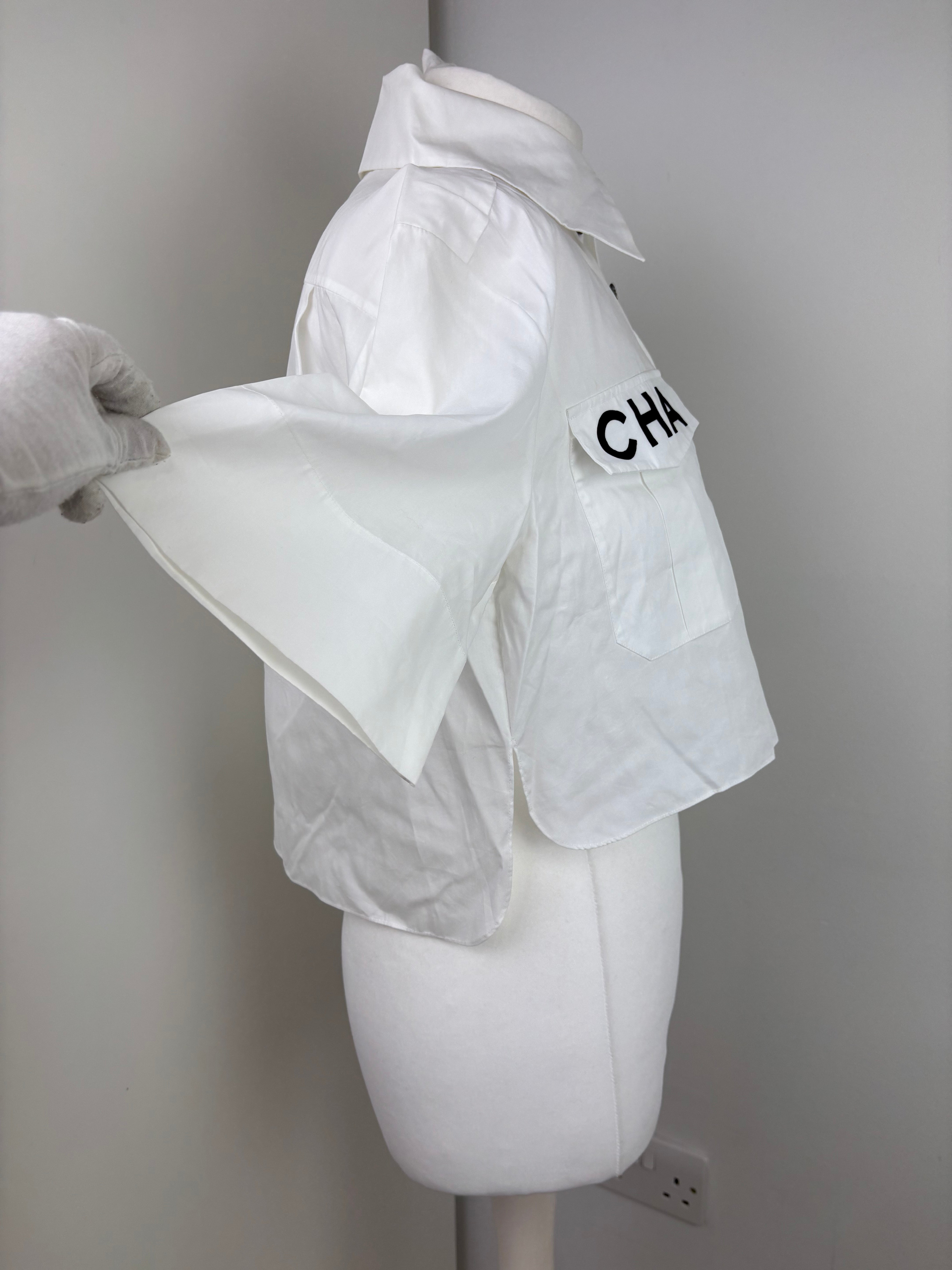 This iconic Chanel cropped shirt is crafted from crisp white cotton. It features a classic collar and elegant buttons down the front. The design is highlighted by two chest pockets, which are embroidered with "CHA" and "NEL" respectively. A sophisticated and modern piece.