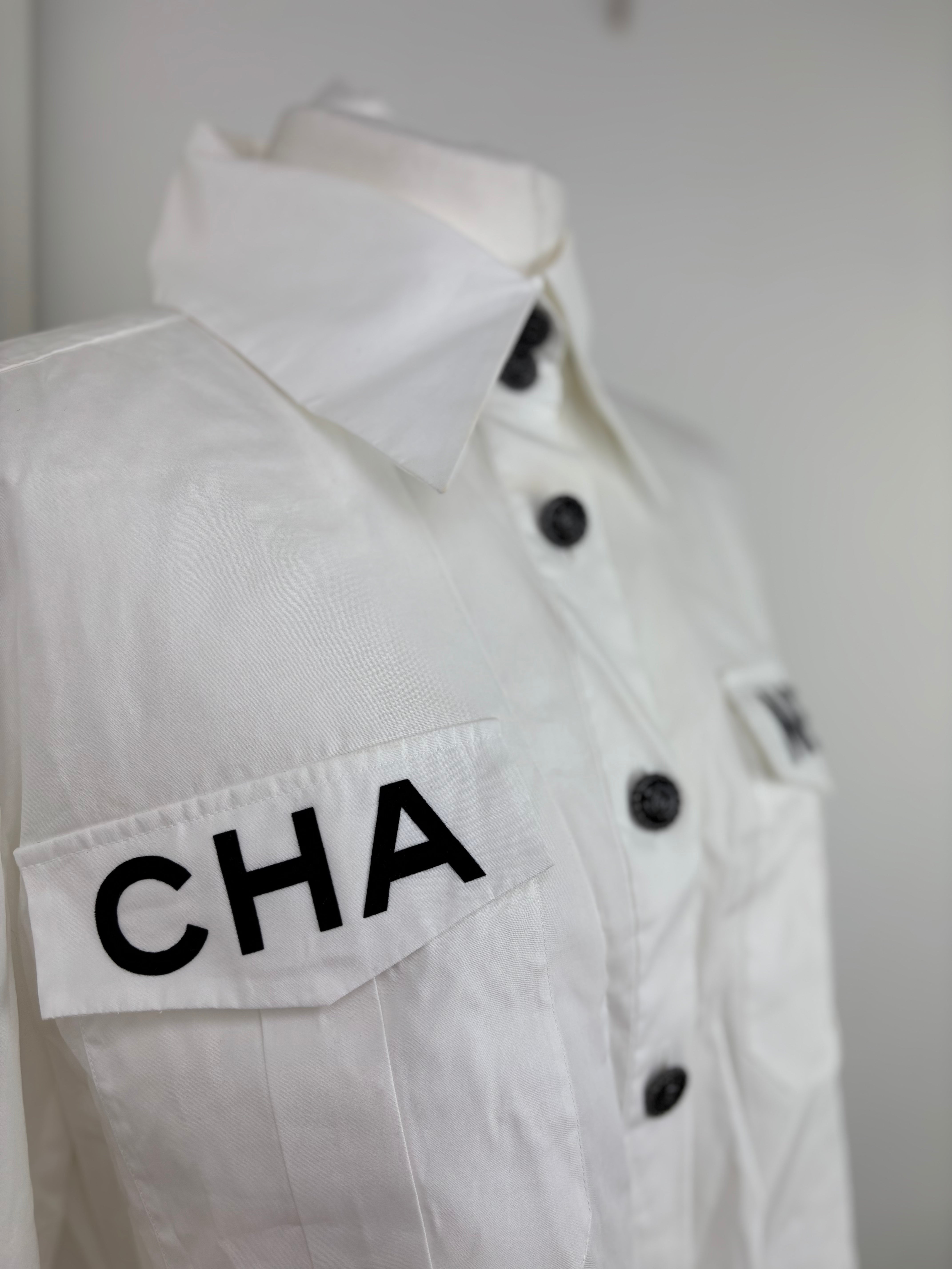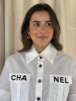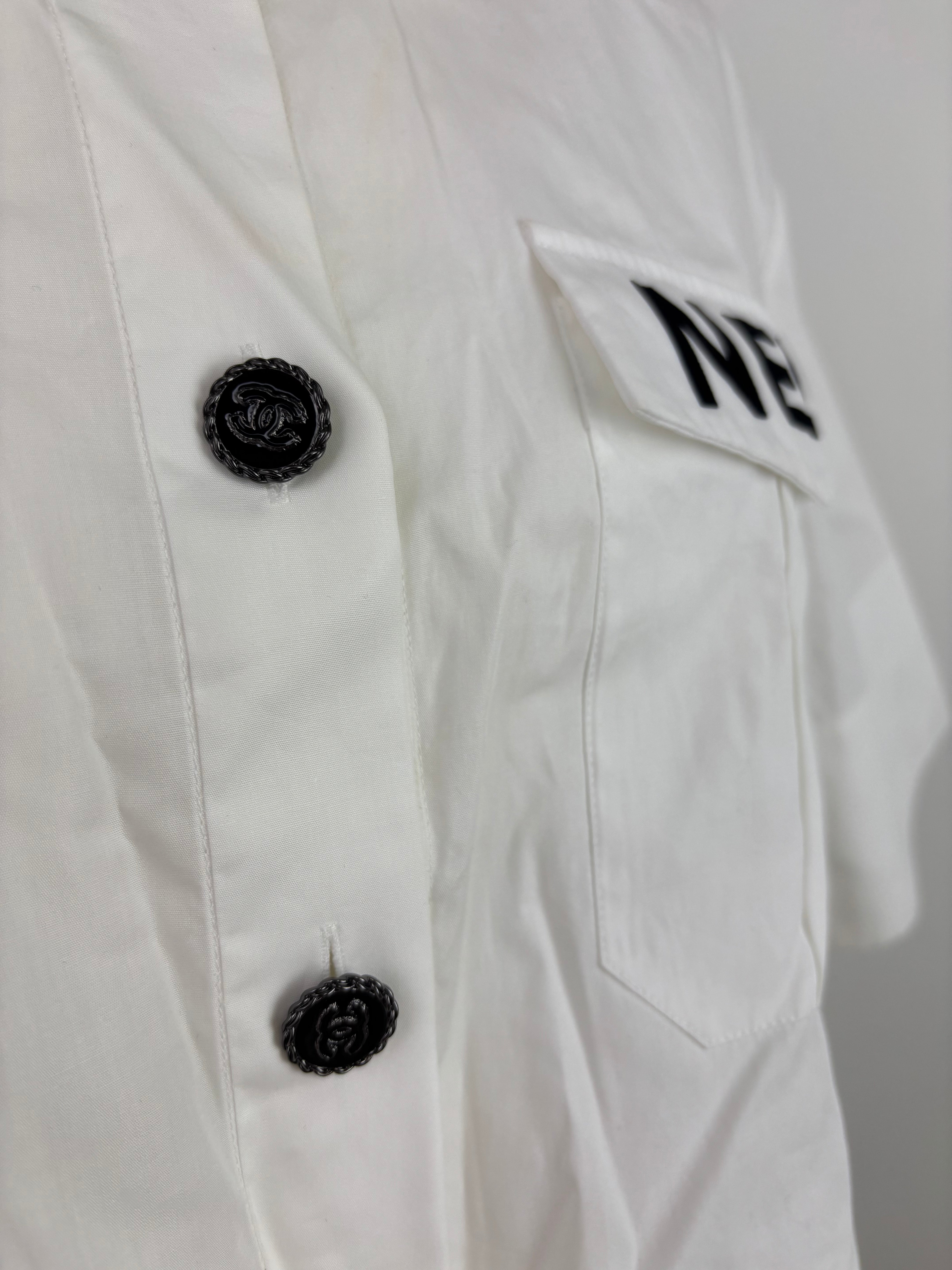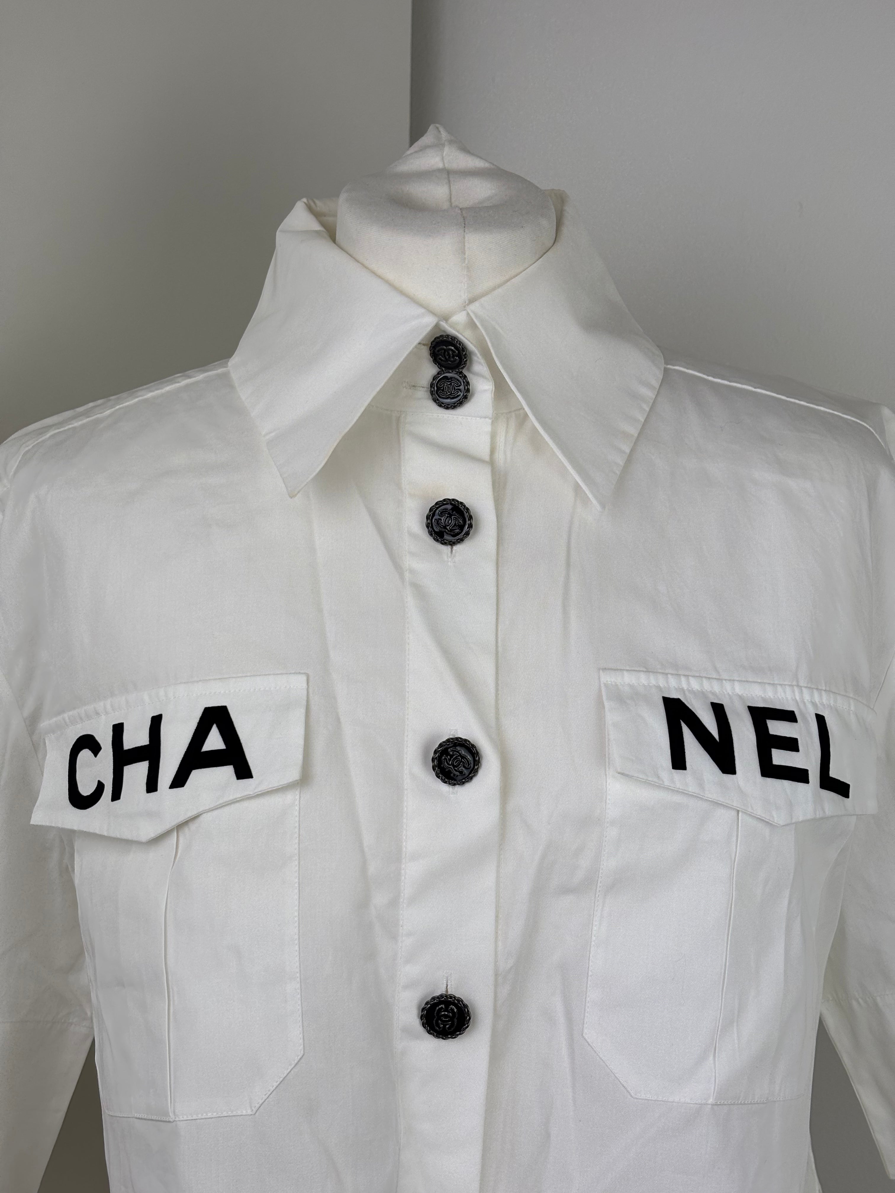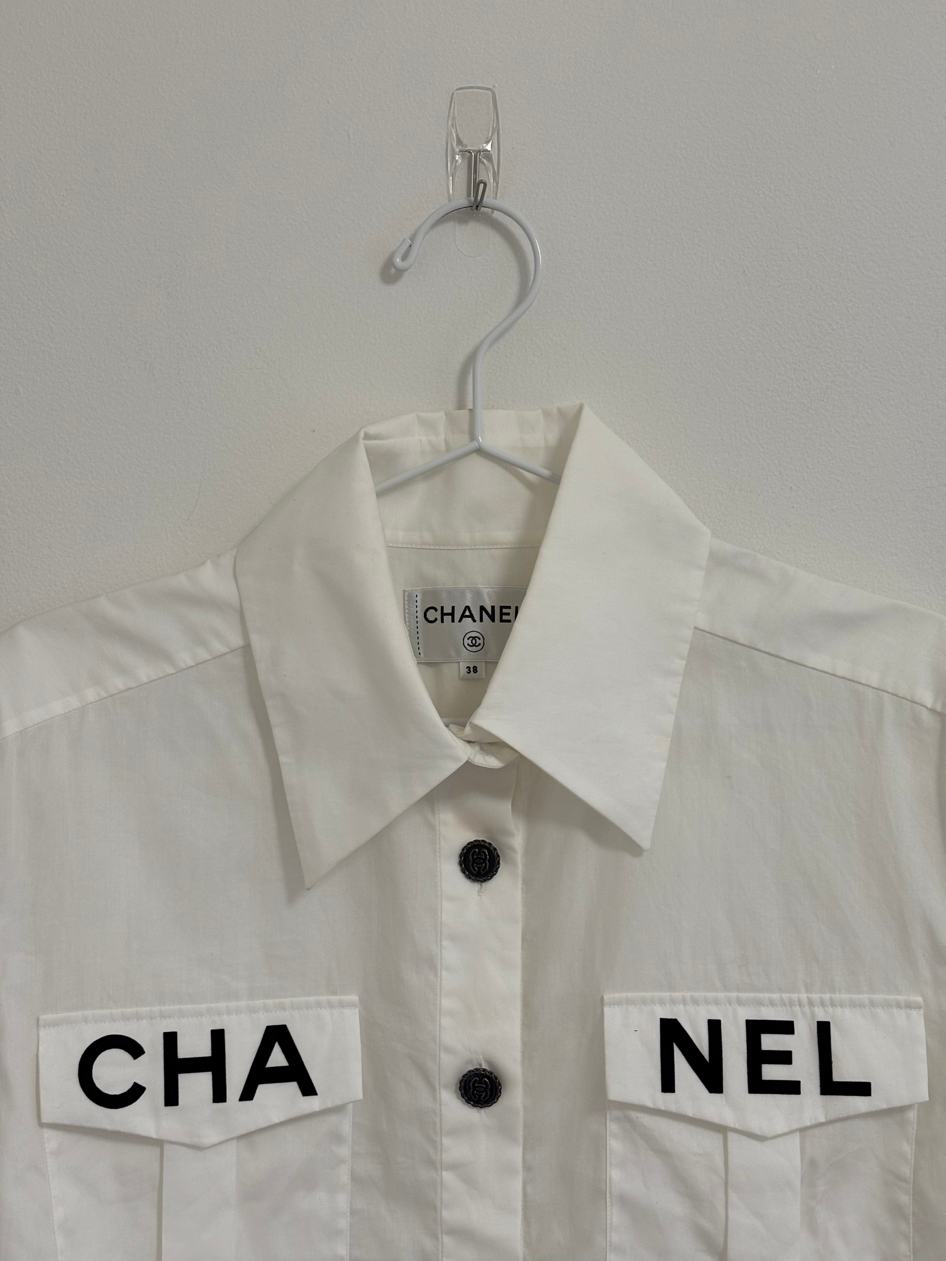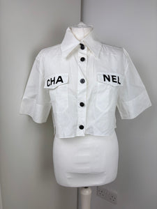 This iconic Chanel cropped shirt is crafted from crisp white cotton. It features a classic collar and elegant buttons down the front. The design is highlighted by two chest pockets, which are embroidered with "CHA" and "NEL" respectively. A sophisticated and modern piece.