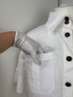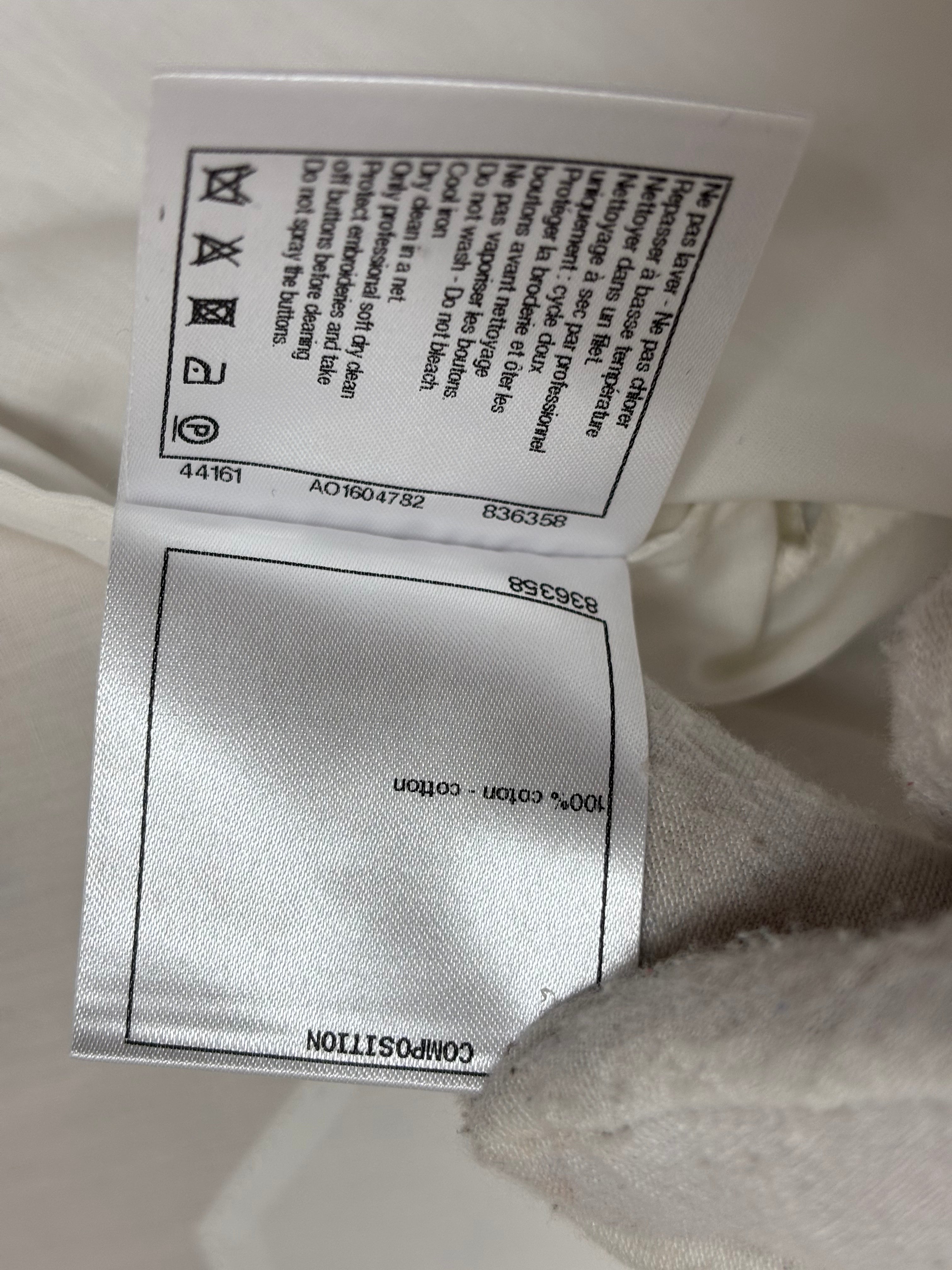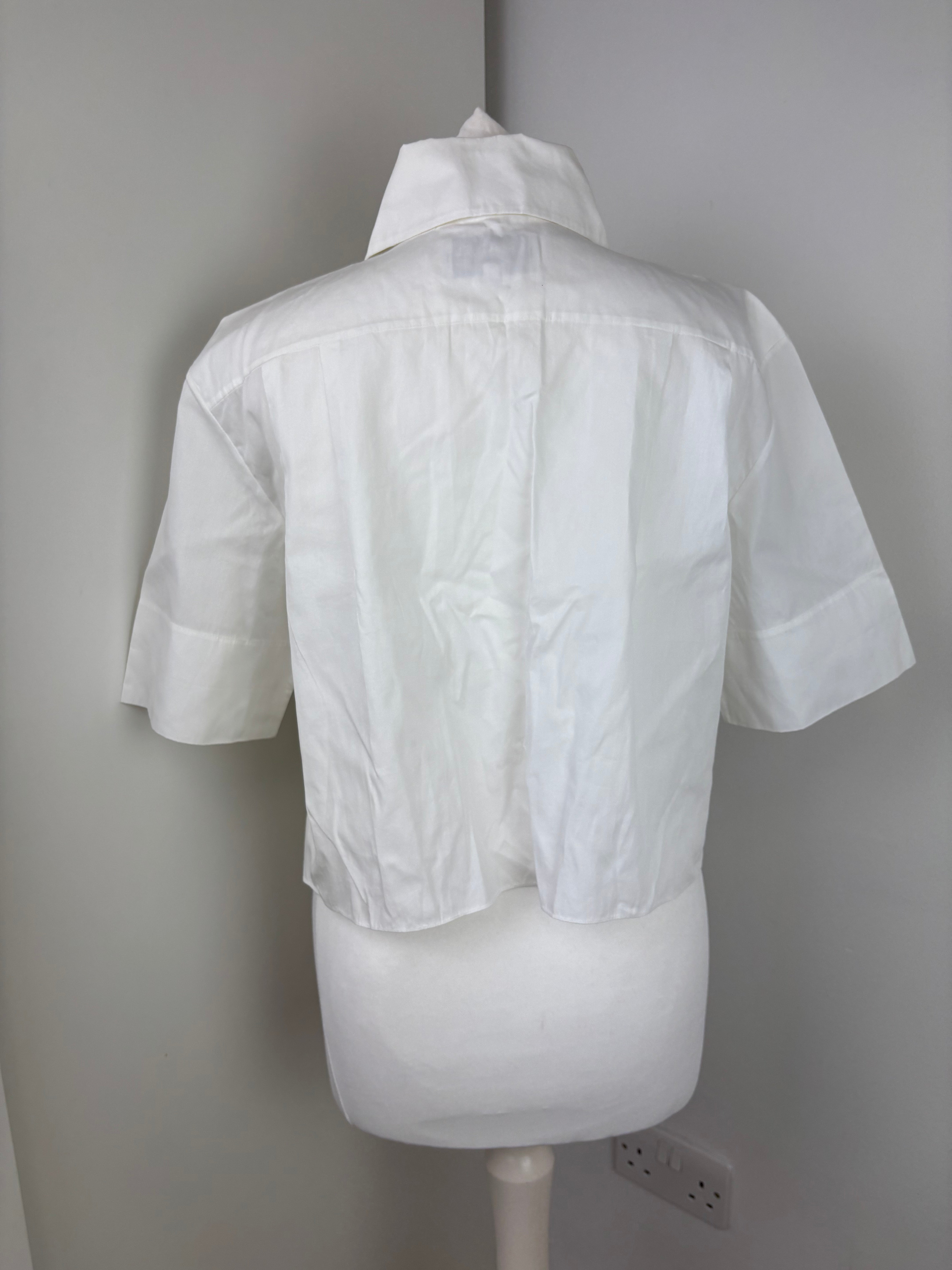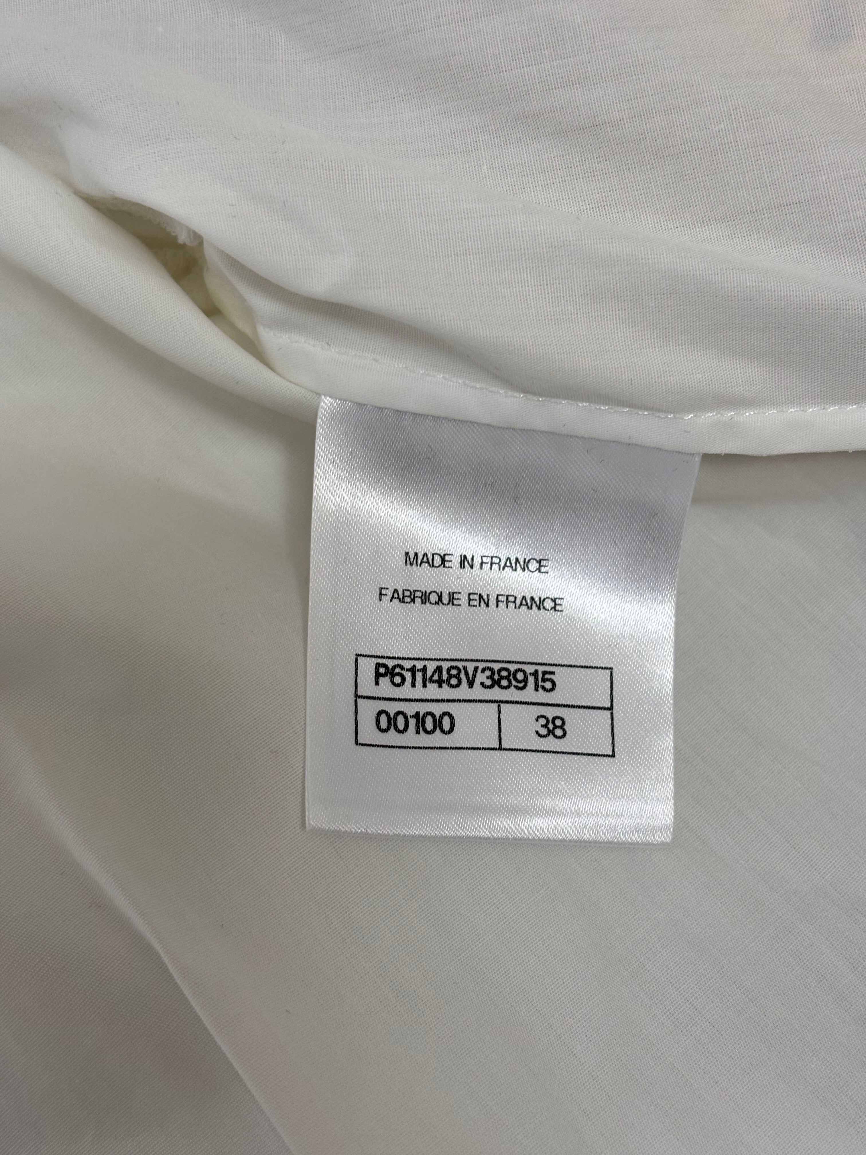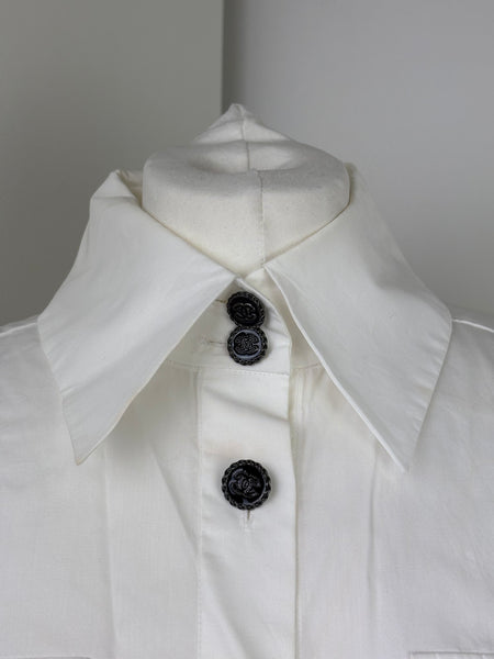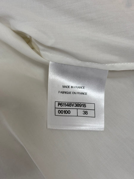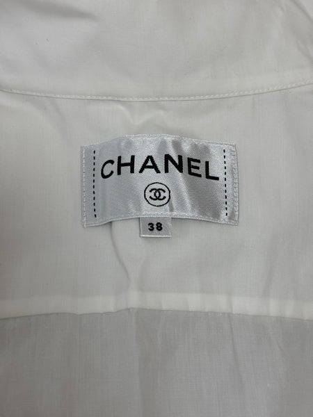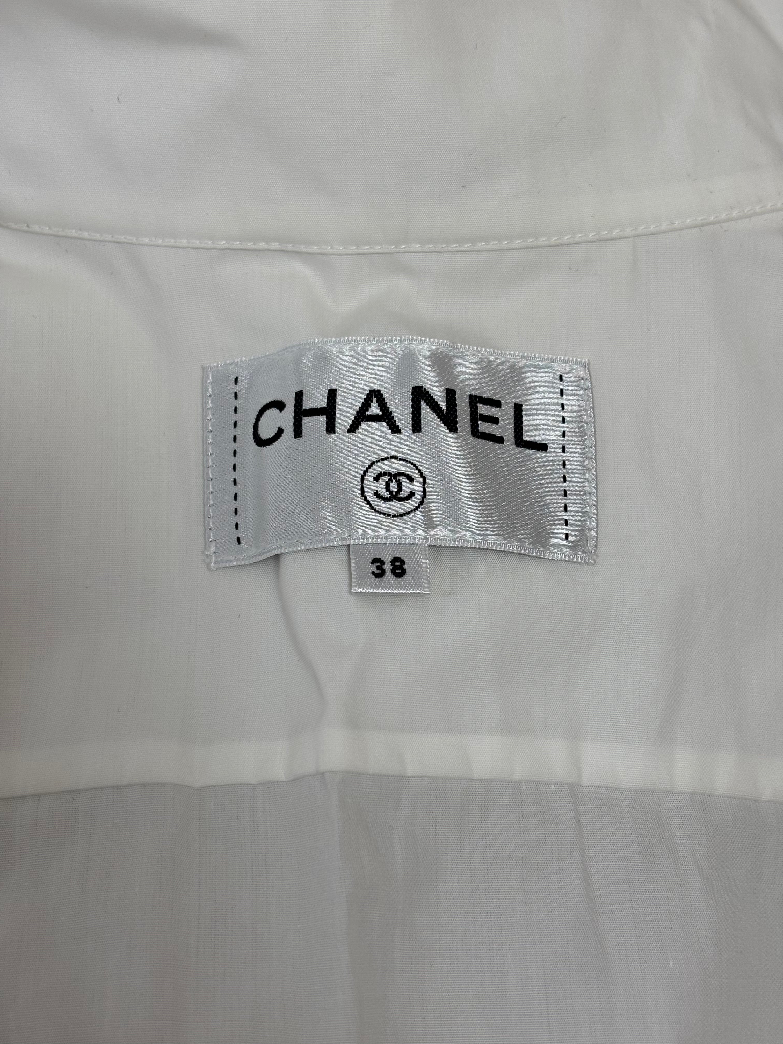 This iconic Chanel cropped shirt is crafted from crisp white cotton. It features a classic collar and elegant buttons down the front. The design is highlighted by two chest pockets, which are embroidered with "CHA" and "NEL" respectively. A sophisticated and modern piece.