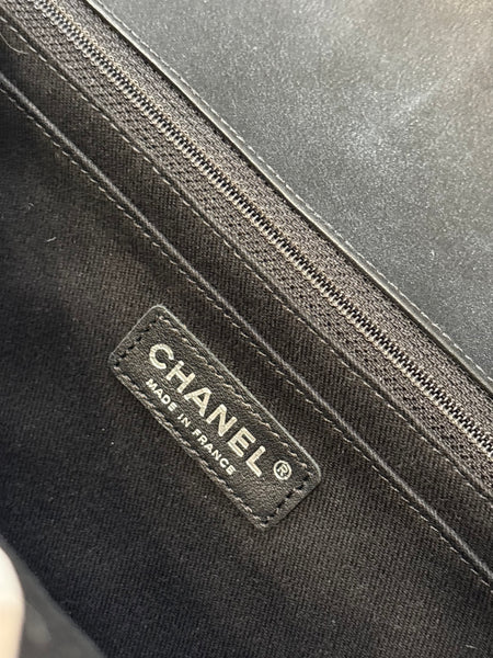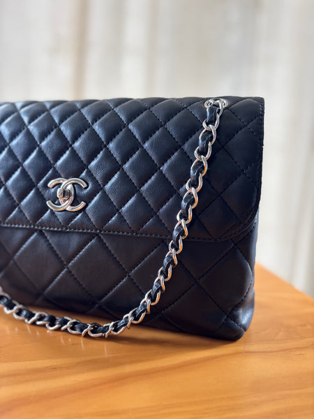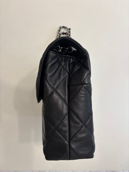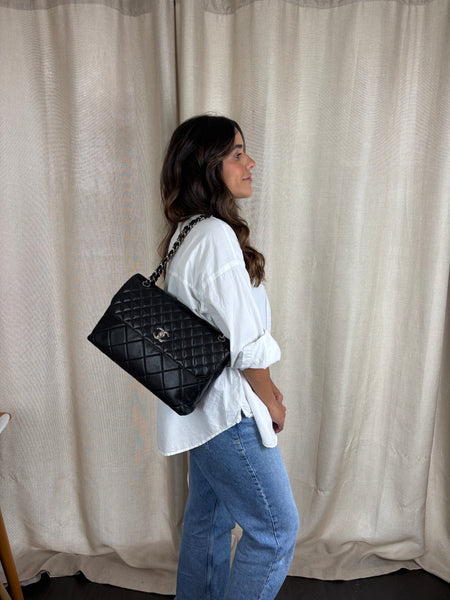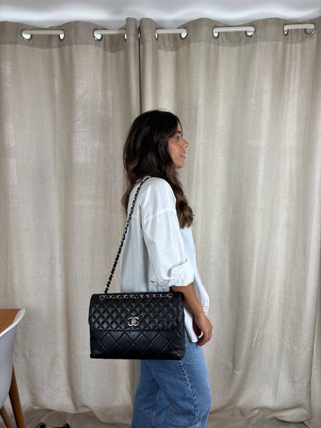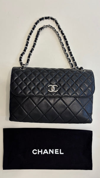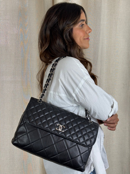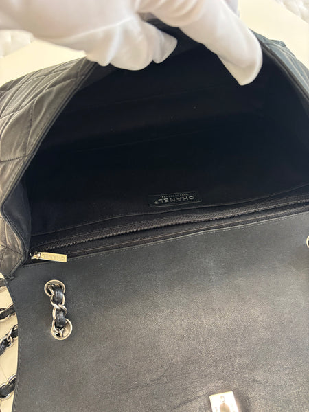 The Chanel Maxi Classic Double Flap Bag in black lambskin with silver hardware is a timeless statement piece, crafted in 2010–2011 with the House’s iconic diamond quilting. Featuring the signature interlocking CC turn-lock, a versatile leather-woven chain strap, and the practical back “Mona Lisa” pocket, it combines elegance with functionality. The spacious Maxi size opens to a double flap with black lining and multiple compartments, making it both a collectible and highly wearable piece.