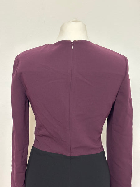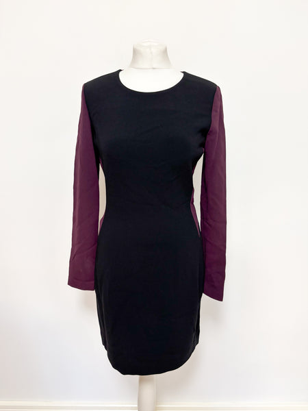 A sleek and sophisticated Diane Von Furstenberg dress featuring a fitted silhouette in deep black with contrasting burgundy long sleeves. The clean round neckline and minimalist design create an elegant, modern look perfect for both officewear and evening occasions. Crafted in a soft, comfortable stretch fabric that flatters the body while allowing ease of movement.