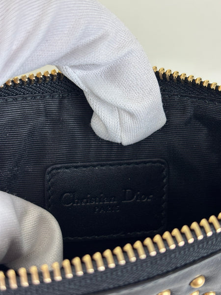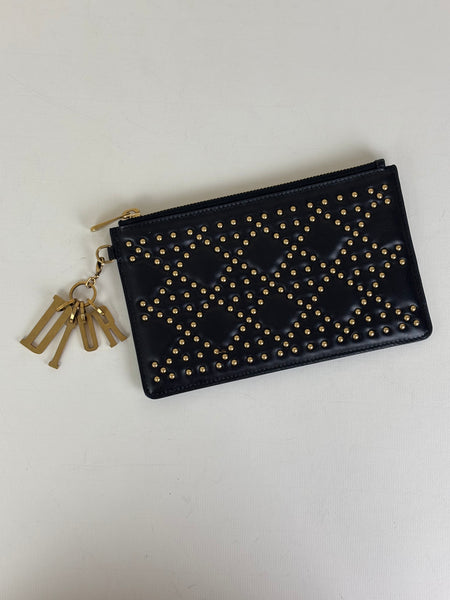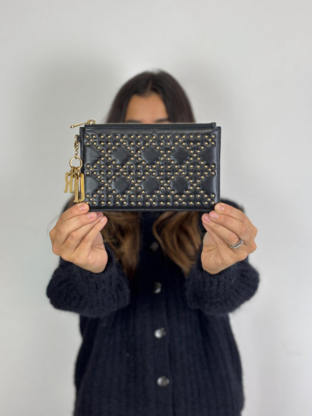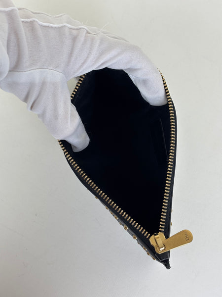 Chic and compact, this Christian Dior Cannage pouch is crafted from smooth black leather adorned with a geometric gold-stud pattern. The highlight is the iconic "DIOR" letter charms attached to the zipper pull, adding a playful movement to this classic accessory. Ideal for use as a clutch or an organised insert for a larger tote.