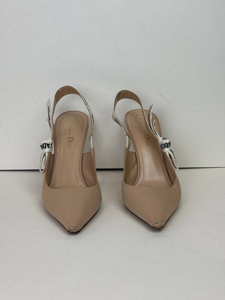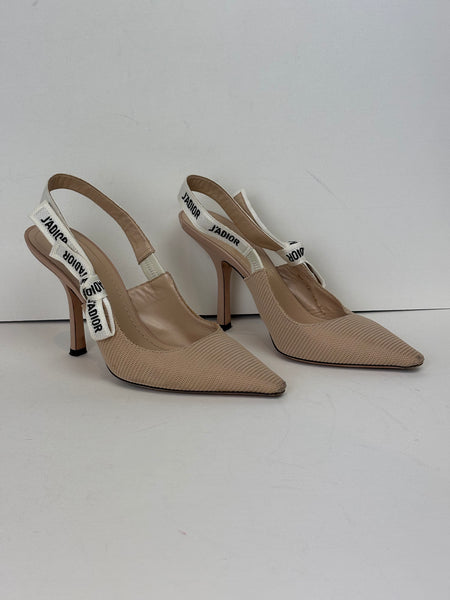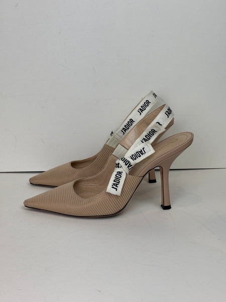 These elegant Dior J'Adior slingback pumps in beige are a timeless addition to any wardrobe. Crafted in Italy from technical fabric, they feature the iconic J’ADIOR embroidered ribbon and a pointed toe silhouette. The mid-heel height offers all-day comfort without compromising on style. Perfect for both professional settings and chic day-to-evening wear.