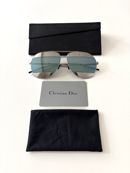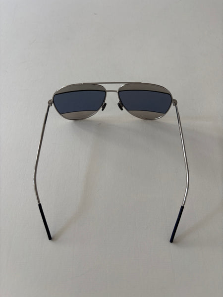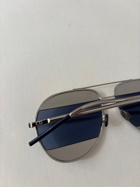These Christian Dior Split Metal sunglasses are a perfect blend of classic and contemporary style. Featuring a sleek silver-toned frame and striking blue mirrored lenses, they add a touch of modern luxury to any look.