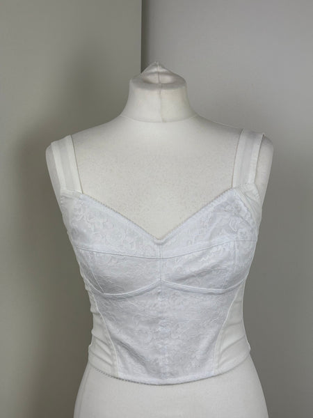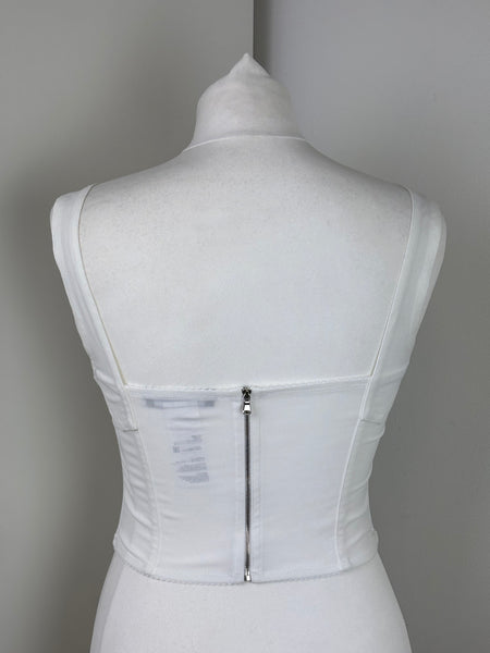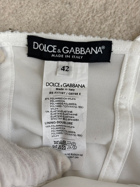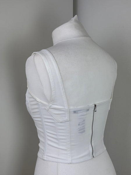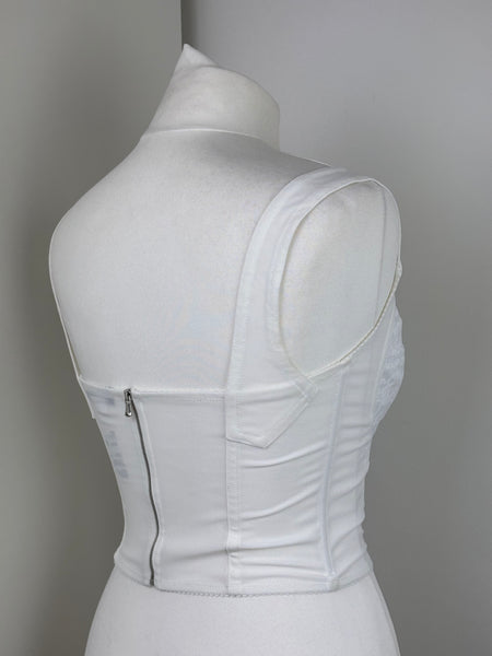 White lace corset-style top by Dolce & Gabbana, with structured seams and adjustable straps. Feminine, versatile, and perfect for layering or wearing as a statement piece.