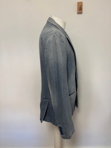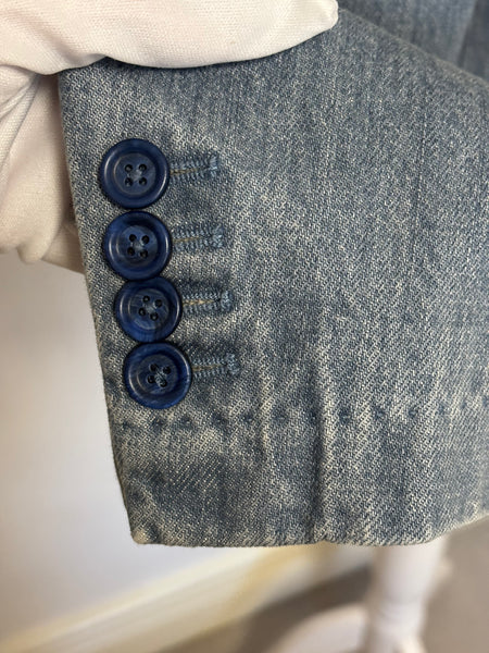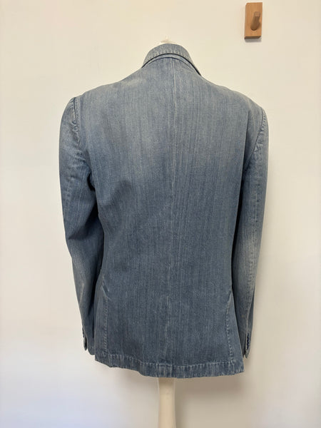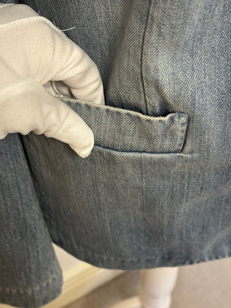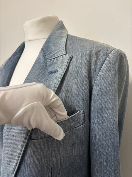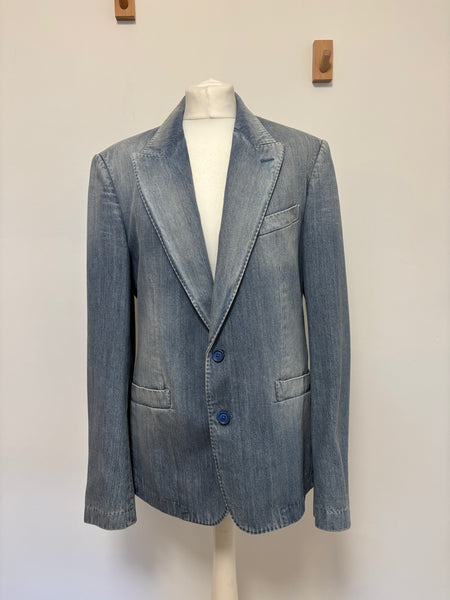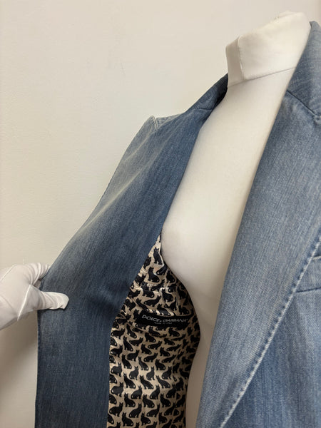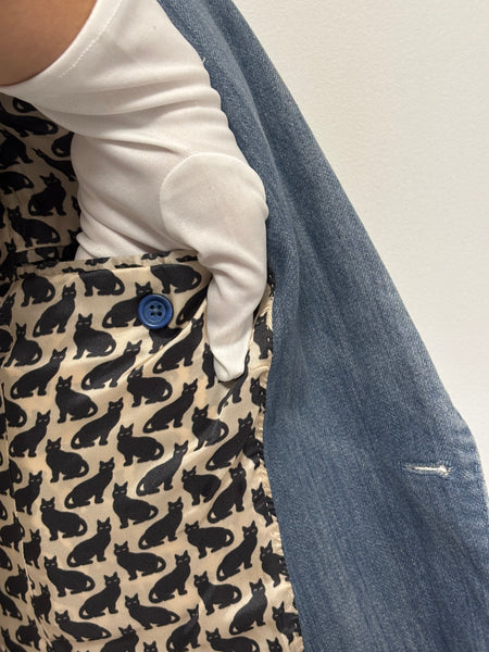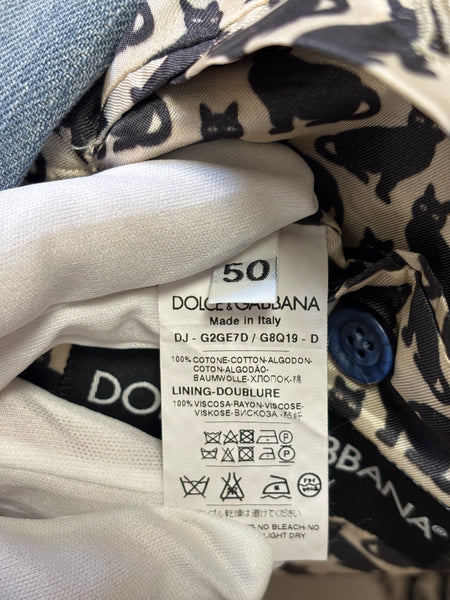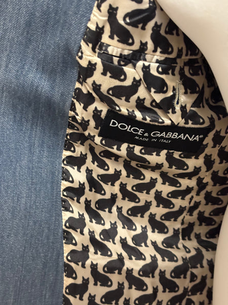 Dolce & Gabbana blazer crafted from washed denim with structured lapels and a two-button closure. The playful surprise lies inside – a printed lining featuring whimsical black cats, adding a signature D&G touch of personality to a wardrobe staple. This blazer is a sharp twist on classic tailoring.