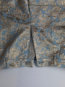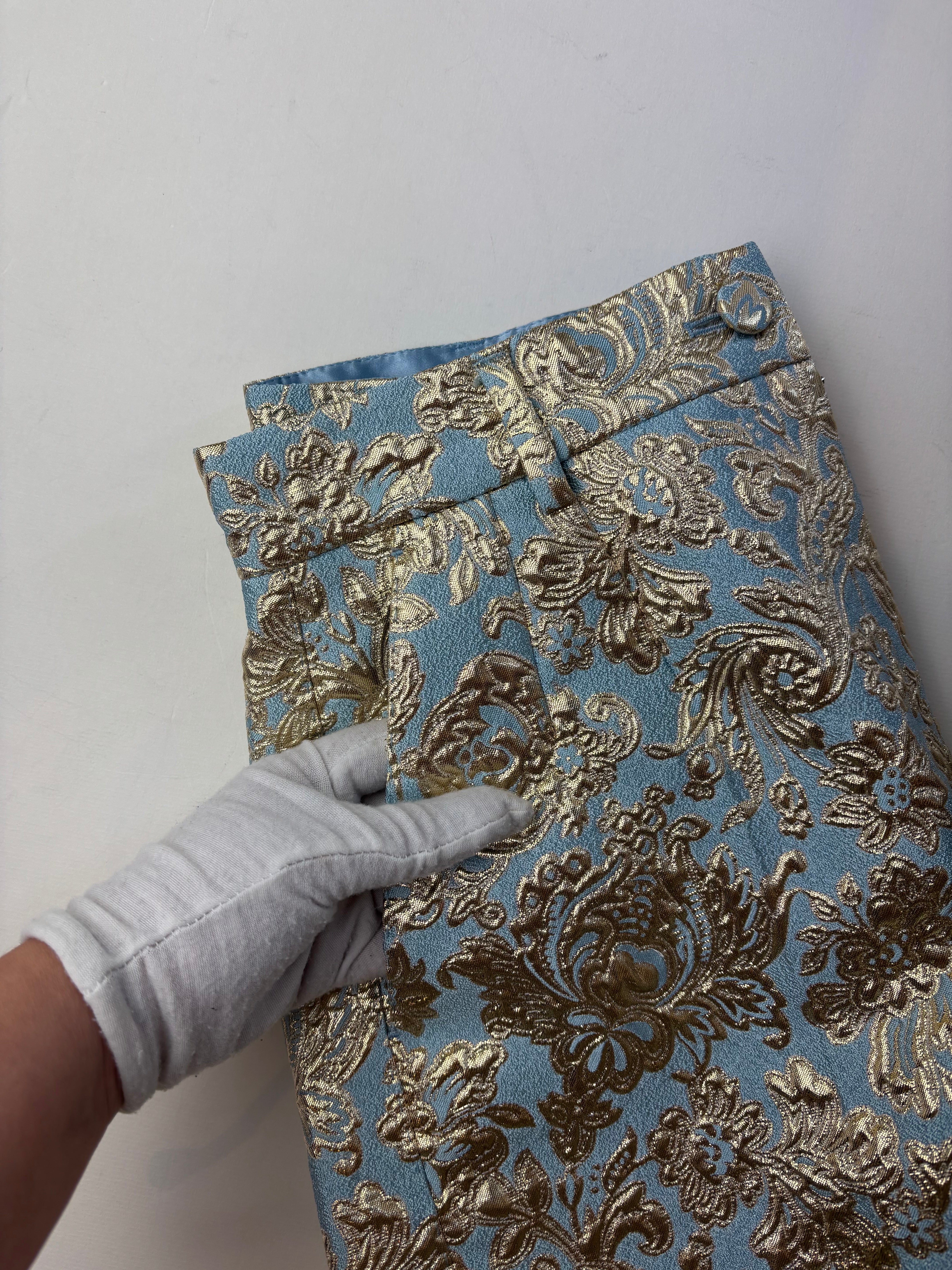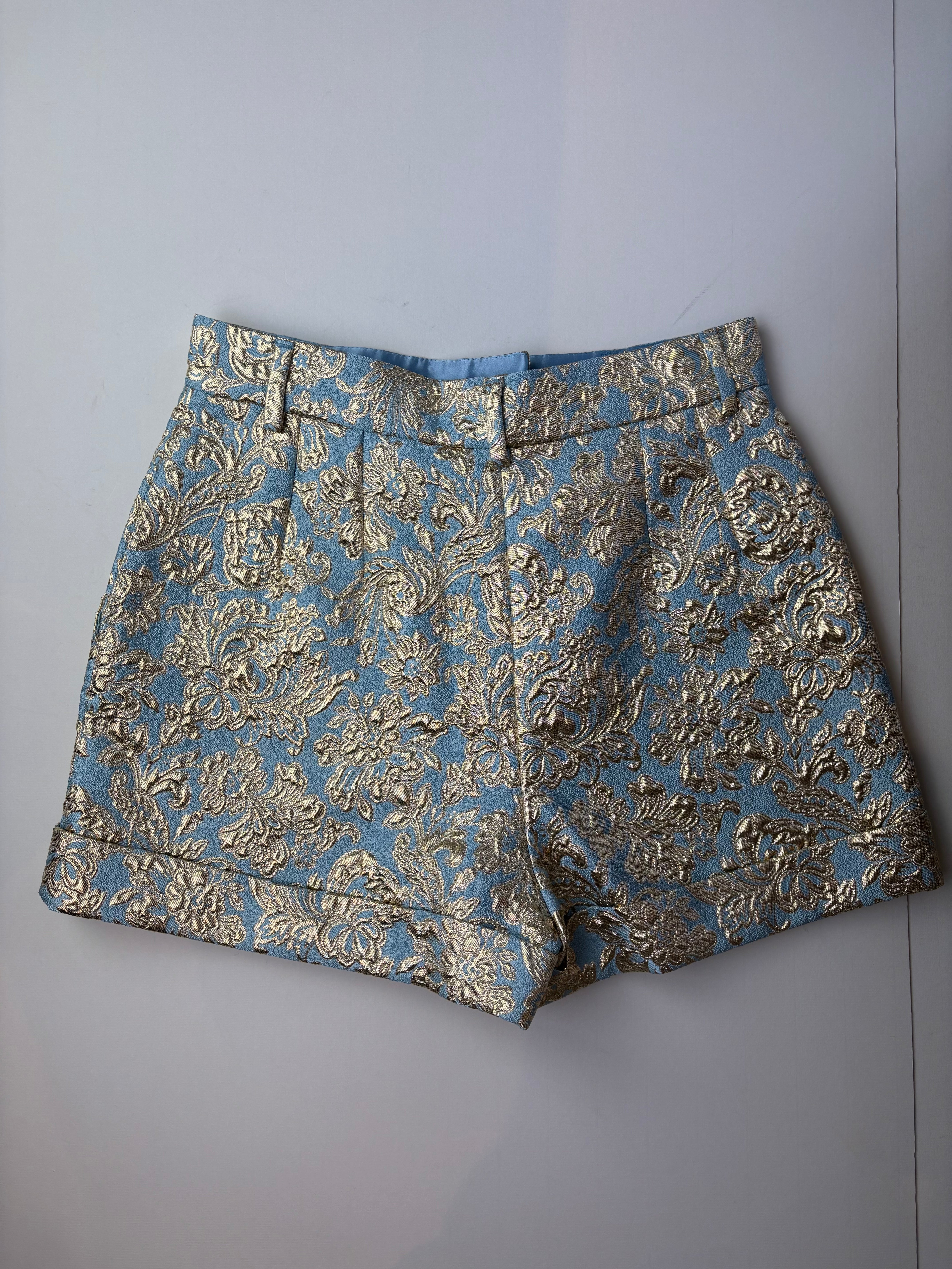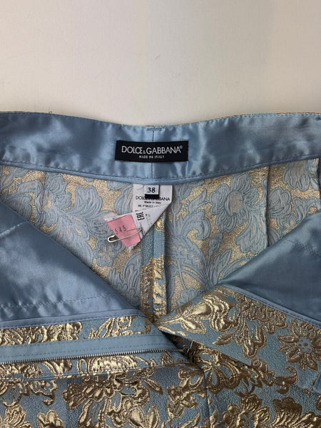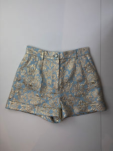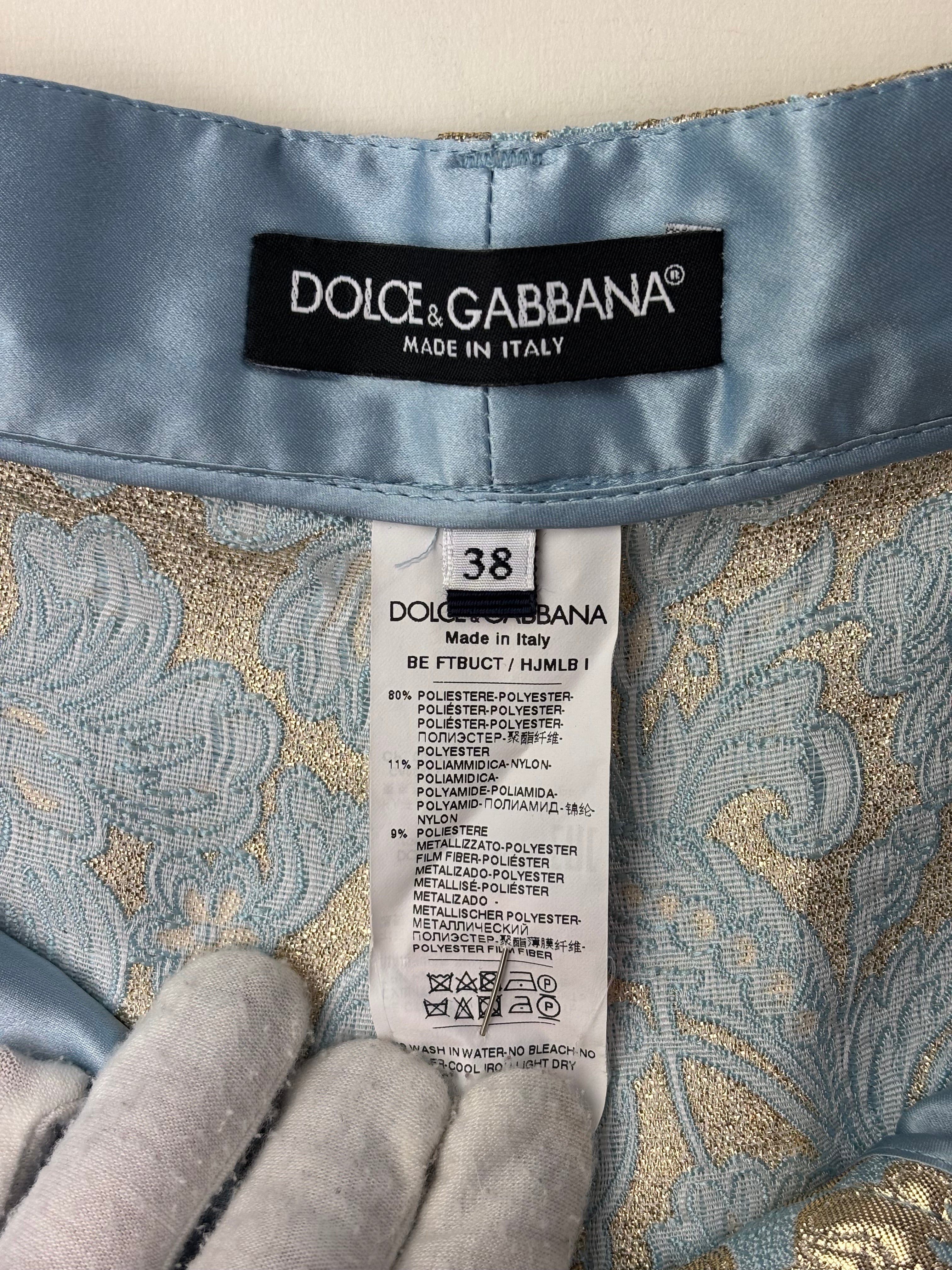 Add a touch of regal charm to your collection with these exquisite Dolce & Gabbana shorts. They feature a soft light blue base adorned with intricate gold metallic brocade. With rich texture and elegant shimmer, it is ideal for parties or chic daywear.