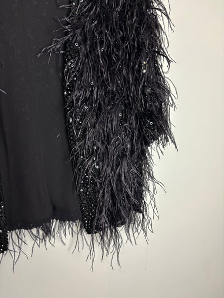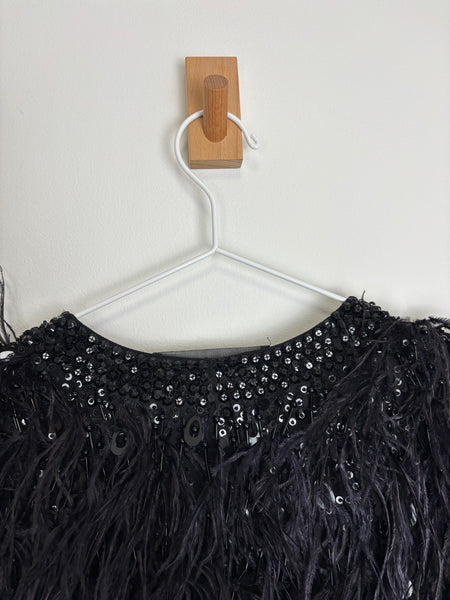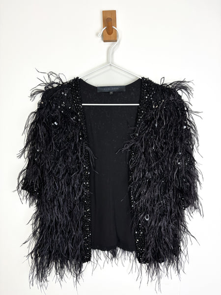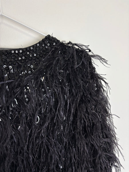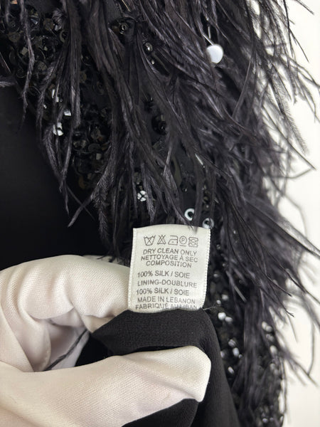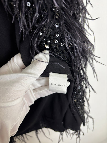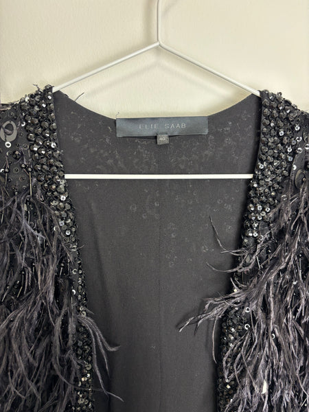 Elevate any look with this show-stopping Elie Saab jacket. This piece features an all-over design of dramatic ostrich feathers in deep black, providing luxurious movement and texture. The feathers are beautifully contrasted by a subtle shimmer of tone-on-tone sequin embellishments woven throughout the body and along the edges. The jacket is cut in an elegant cropped silhouette with a relaxed, open front style and short sleeves, making it the perfect statement layer for evening wear.