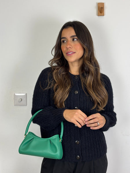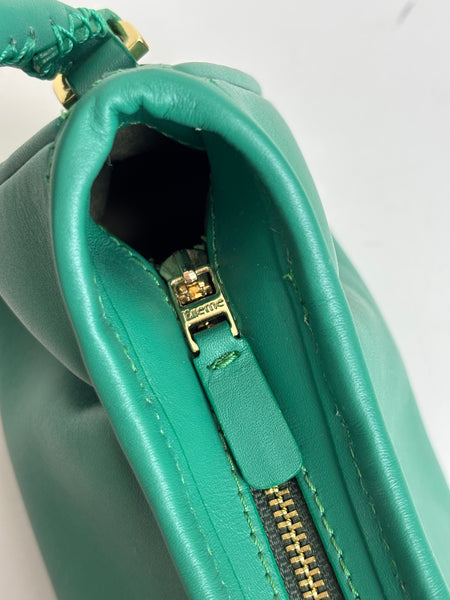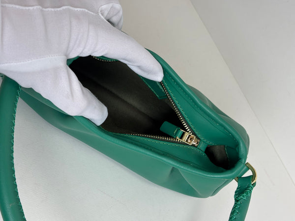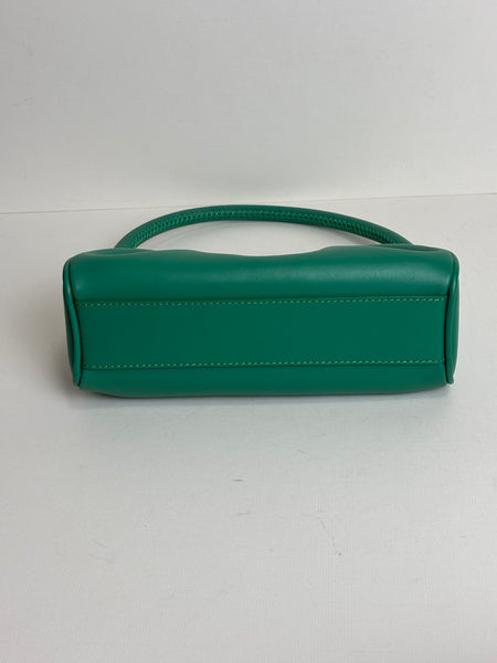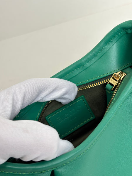 This Elleme Paris small Dimple top-handle bag is a chic fusion of modern geometry and vintage inspiration. In a sophisticated leather design and a vibrant emerald green, its structured silhouette is complemented by a curved, rigid handle and a minimalist interior, making it the perfect accessory to add a pop of colour to a monochrome outfit or an elegant touch to your evening ensemble.