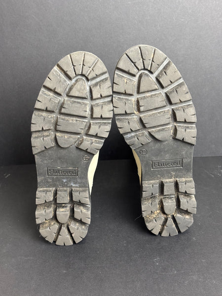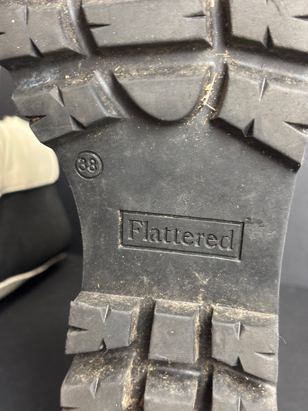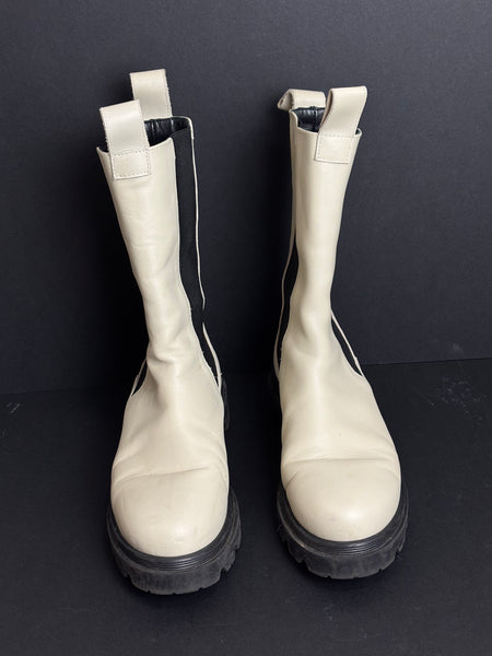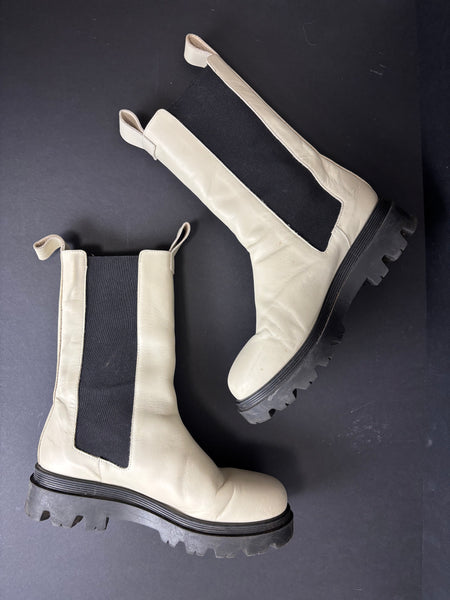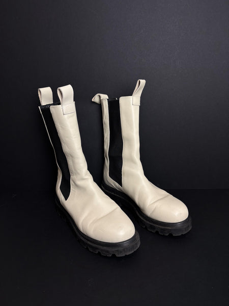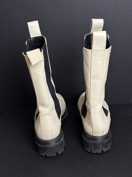 A modern take on a classic, these Flattered boots feature a crisp white leather upper contrasted by a rugged black lug sole. The elongated silhouette and elasticated side panels offer a sleek, "scandi-chic" look, making them the perfect versatile staple for an urban wardrobe.