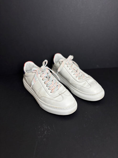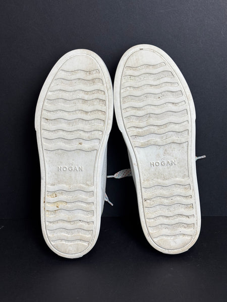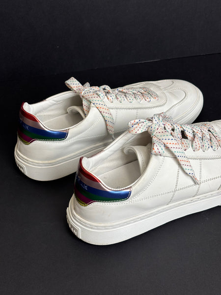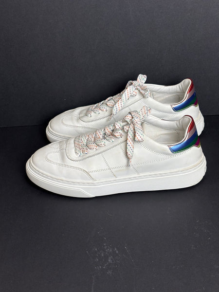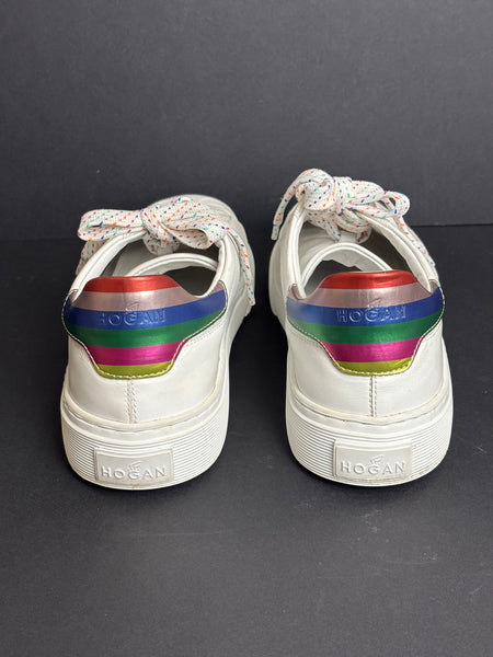 A vibrant update to the classic court sneaker, the Hogan H630 blends retro vibes with contemporary luxury. These sneakers feature a crisp white calf leather upper accented by a playful rainbow-striped heel tab and matching multi-coloured laces. The lightweight EVA platform sole offers a subtle height boost and exceptional all-day comfort.