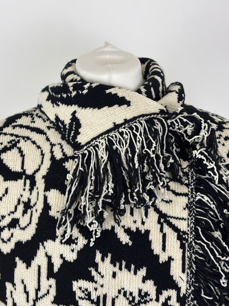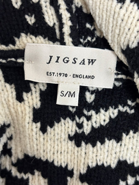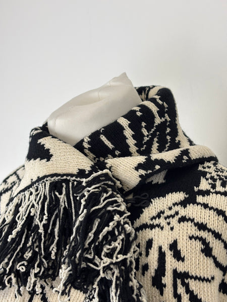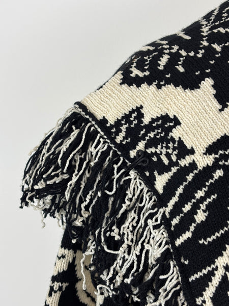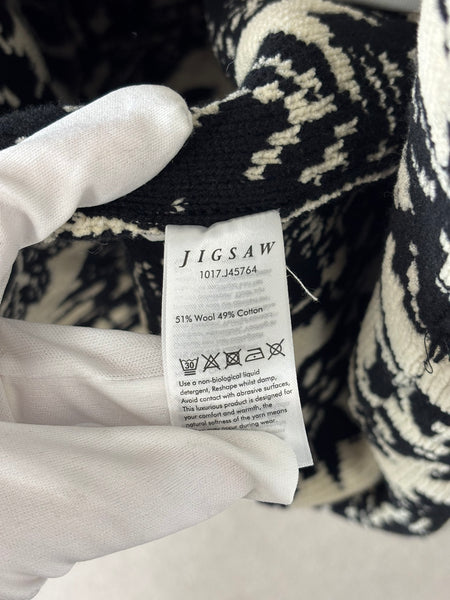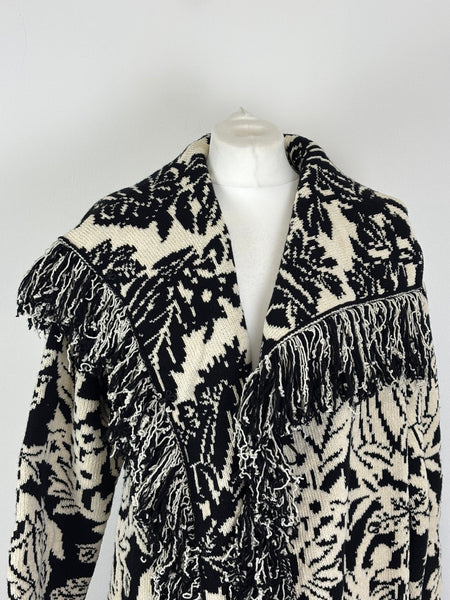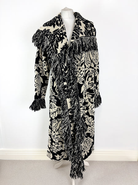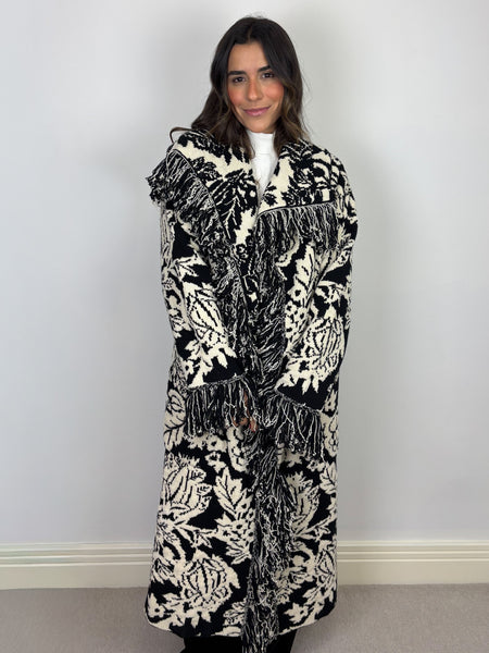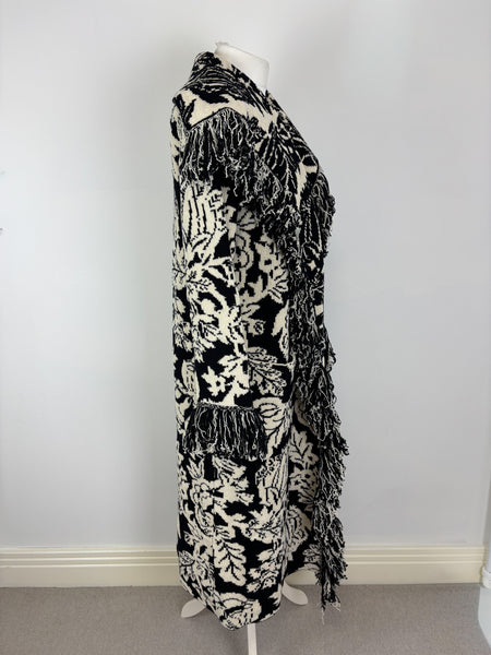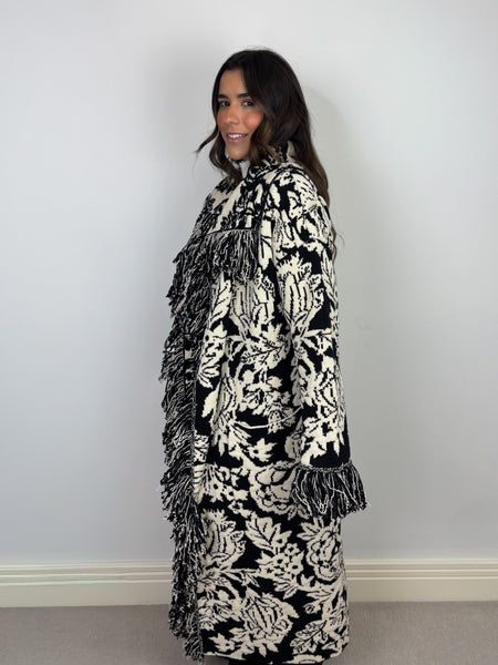 A striking longline cardigan from Jigsaw featuring a bold, monochromatic botanical intarsia knit. This artistic piece is defined by its dramatic fringed trim along the shawl collar, cuffs, and hem, adding movement and texture. Designed with a relaxed, open-front silhouette, it serves as the perfect transitional coat/cardigan for the stylish ladies.