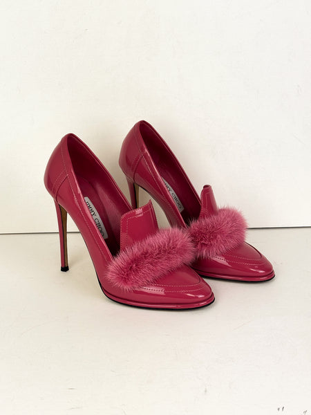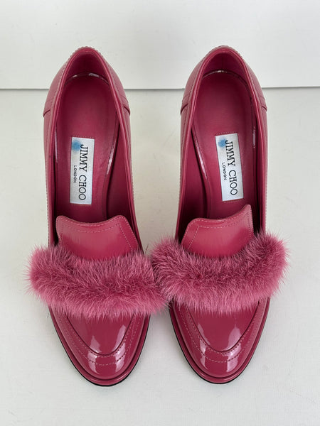Elevate your evening wardrobe with these striking Jimmy Choo Lyzla loafer pumps. Crafted in Italy from high-shine patent leather in a bold fuchsia pink, these heels feature a playful yet sophisticated faux-fur pom-pom detail across the vamp. The pointed-toe silhouette and slim stiletto heel create a leg-lengthening effect, making them the perfect statement piece for your next special occasion.