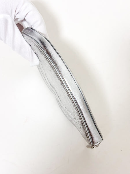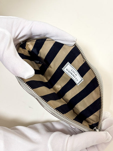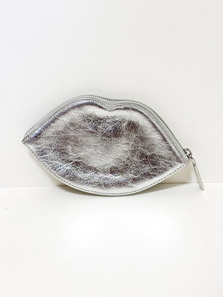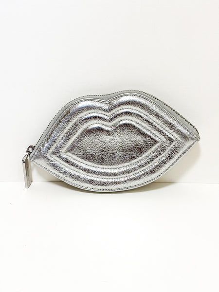 Add a fun and bold touch to any outfit with this iconic Lulu Guinness clutch. The handbag, shaped like a pair of lips, is made of a metallic silver leather with a quilted finish that adds texture and dimension. Its irreverent design and unique shape make it a statement piece, ideal for a night out or for anyone looking for an accessory that truly stands out.