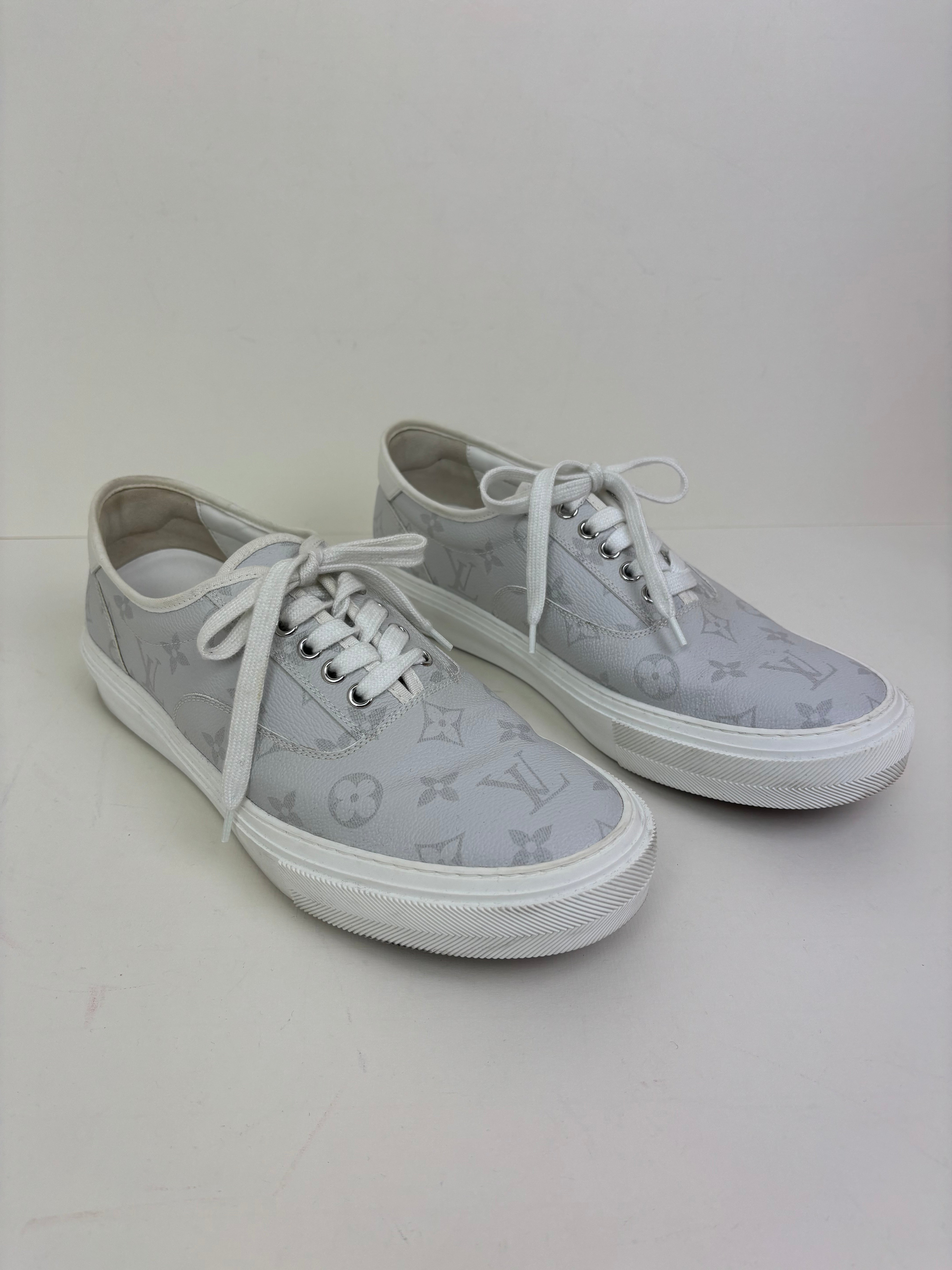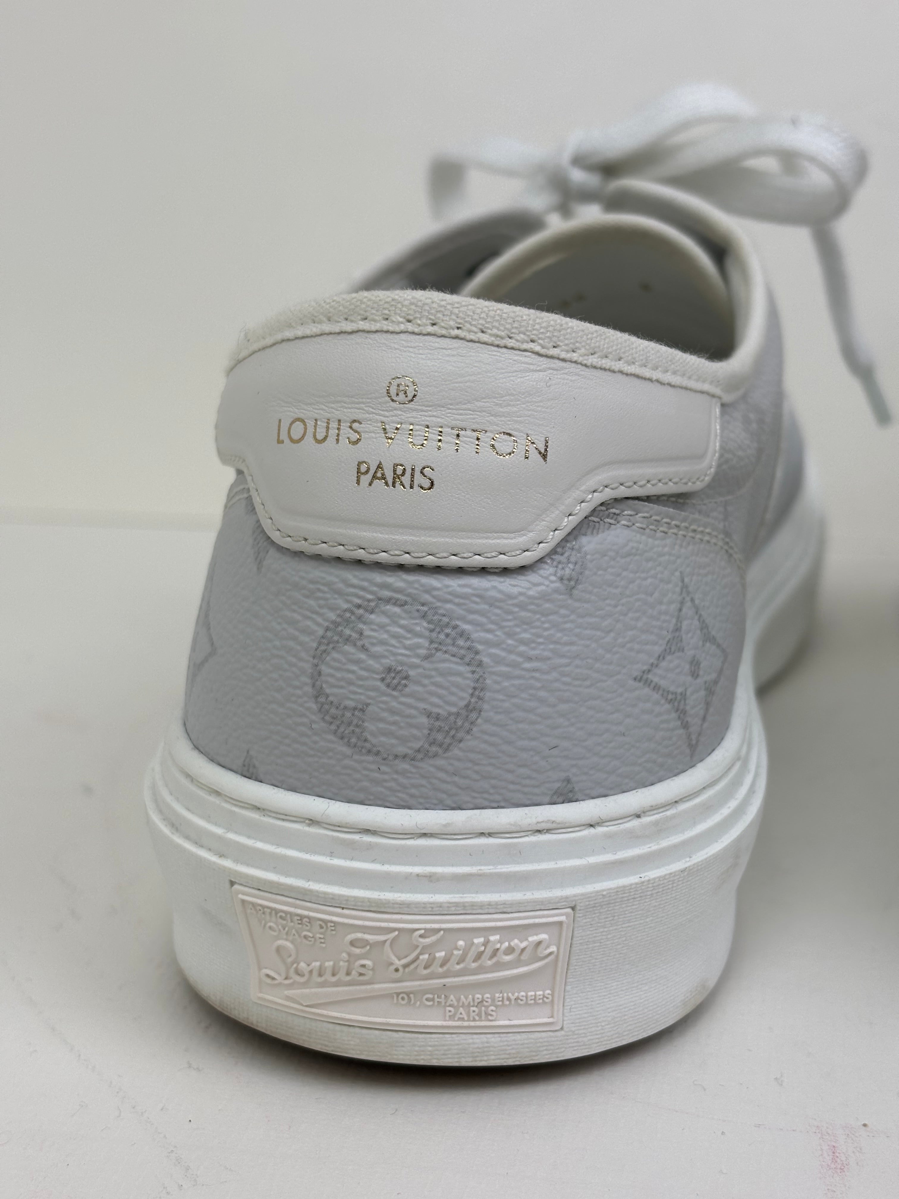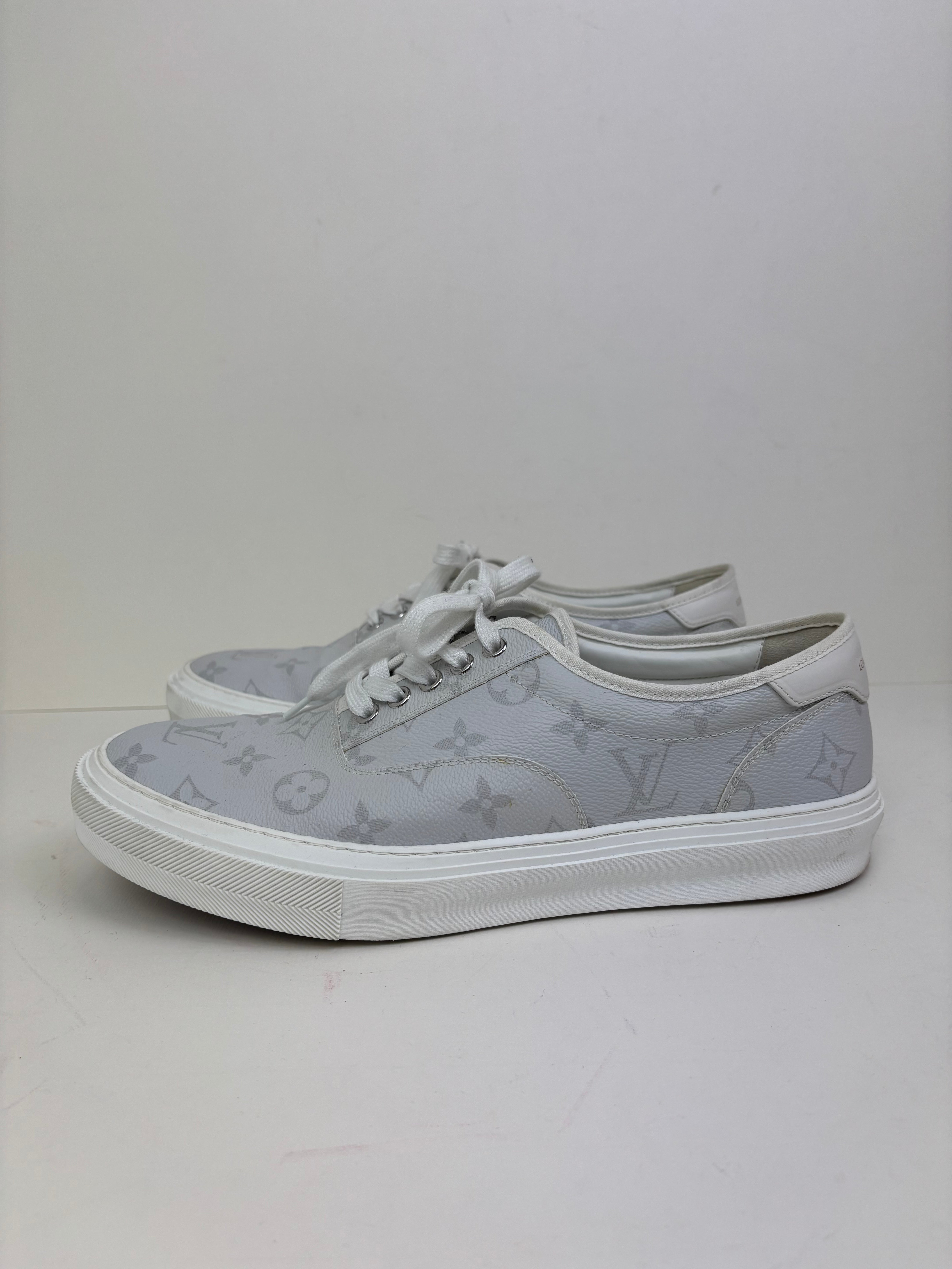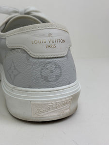 Louis Vuitton trainers in grained calf leather. An ideal alternative to formal shoes, their understated design is complemented by discreet signatures, including the LV Initials and Monogram Flowers on tonal colour canvas trim. This model features white upper laces and rubber sole.