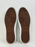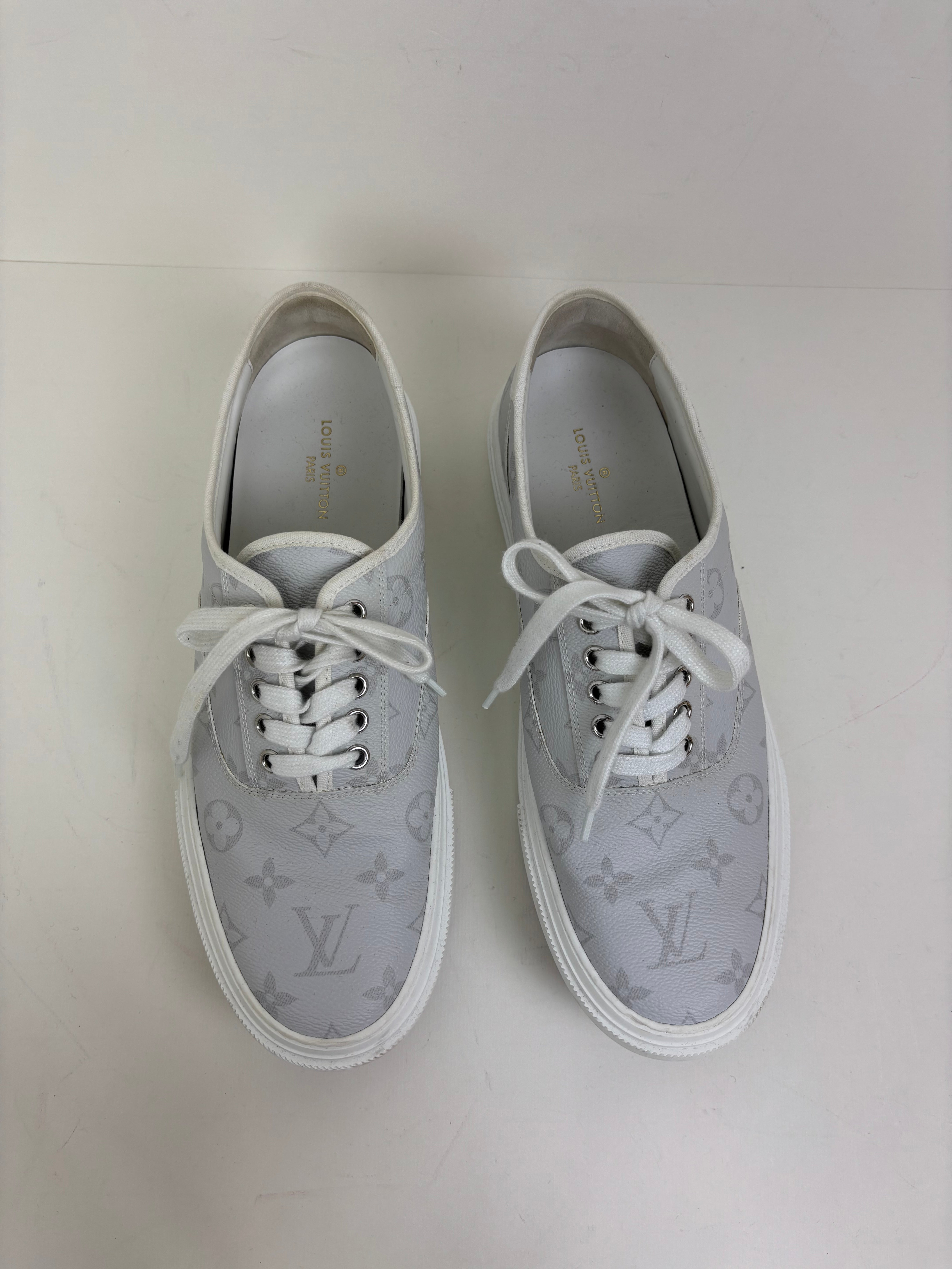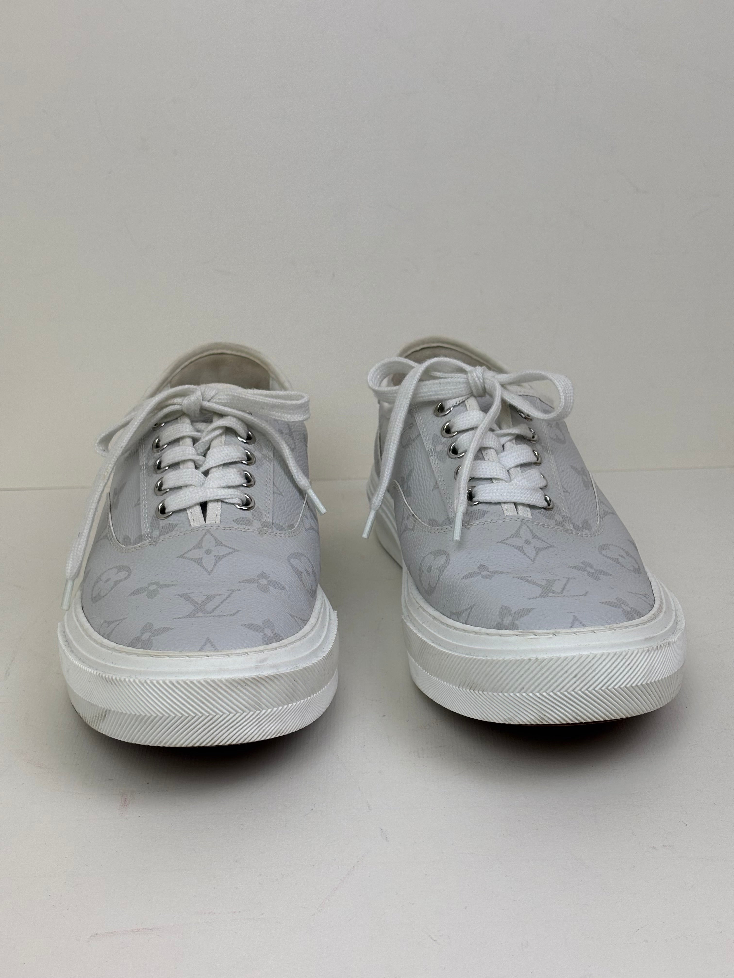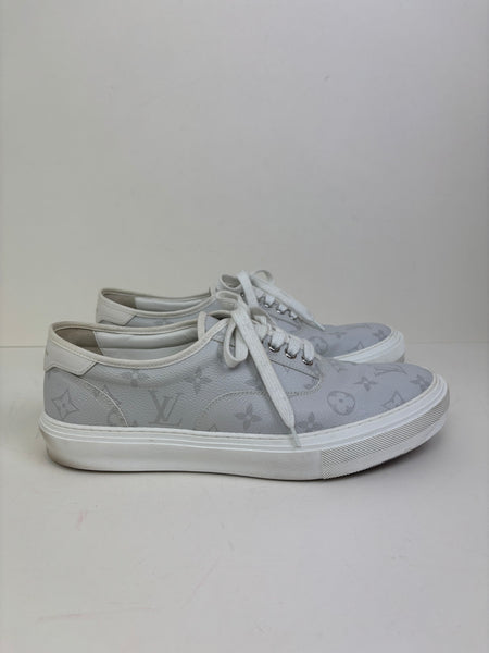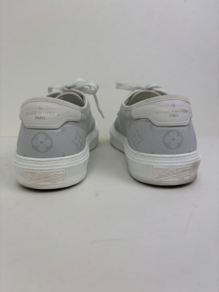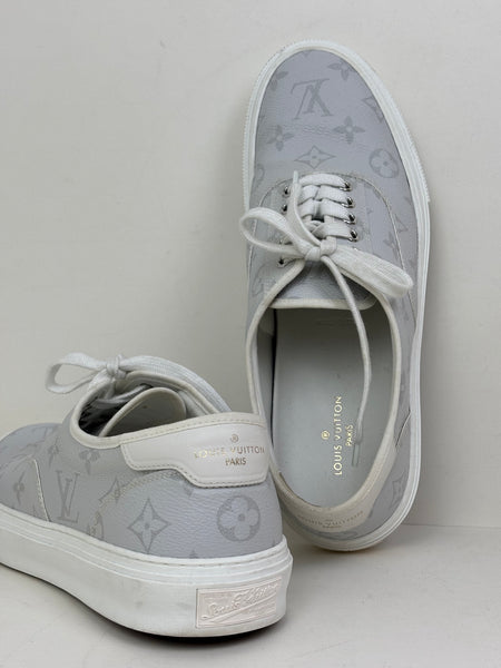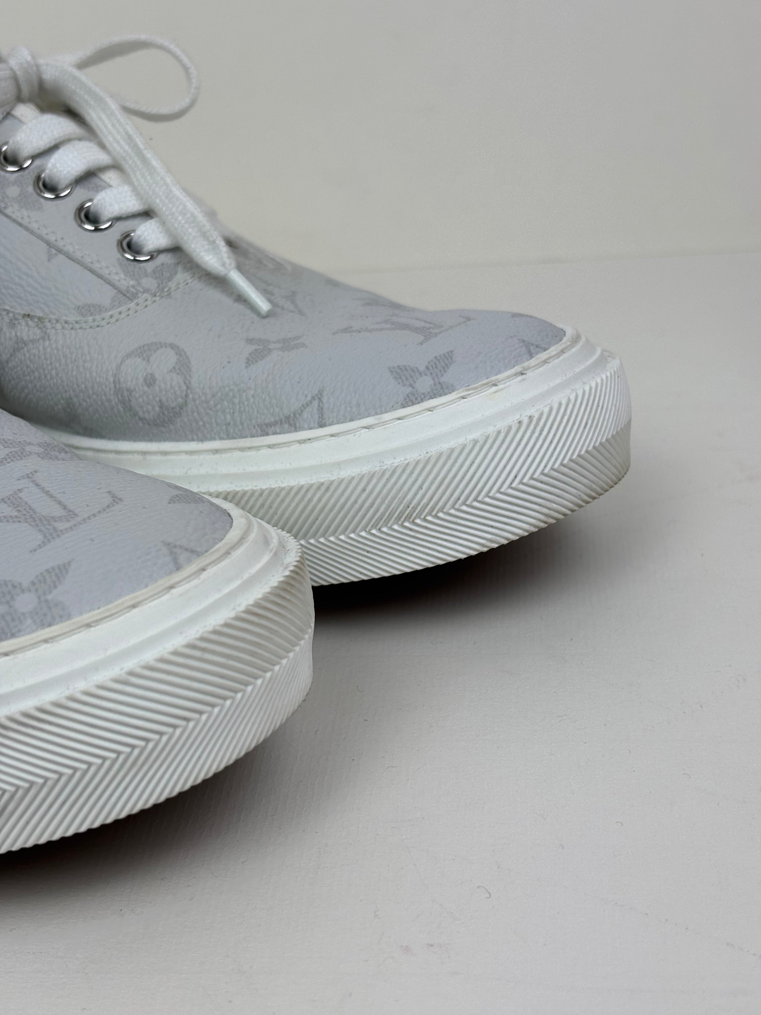 Louis Vuitton trainers in grained calf leather. An ideal alternative to formal shoes, their understated design is complemented by discreet signatures, including the LV Initials and Monogram Flowers on tonal colour canvas trim. This model features white upper laces and rubber sole.