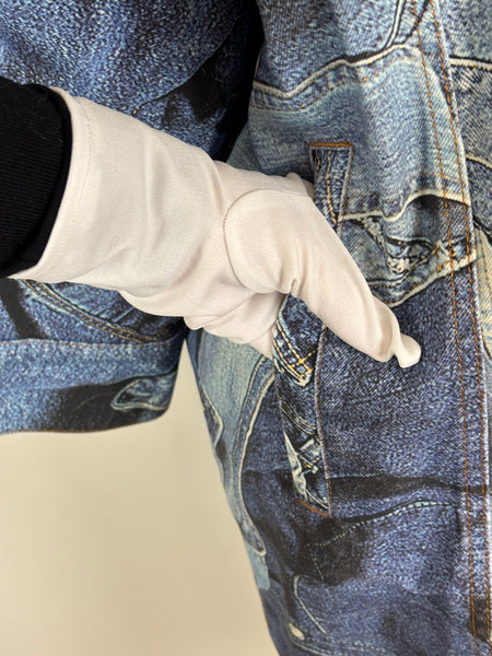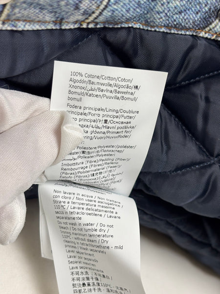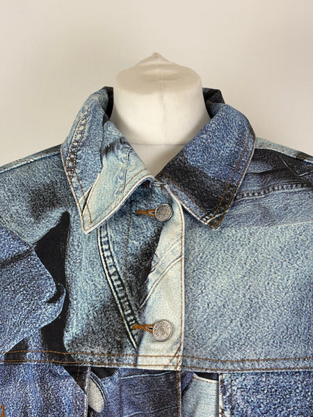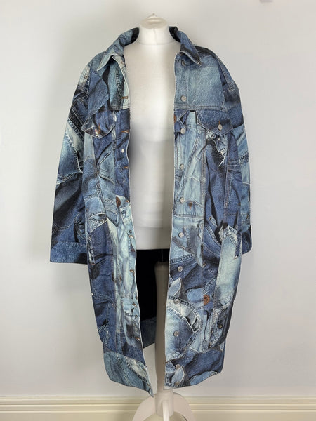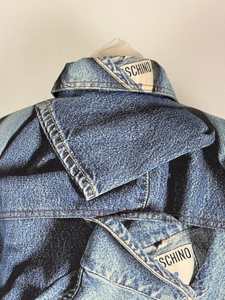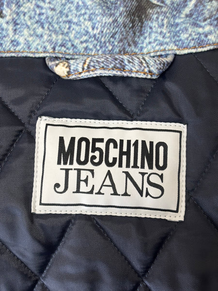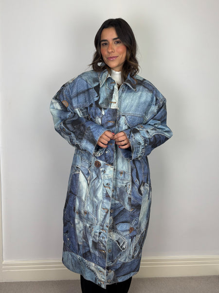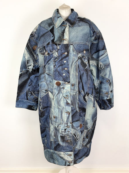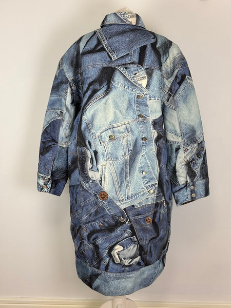 A rare and playful gem from the Moschino Jeans archives. This statement coat features a masterful trompe l'oeil (optical illusion) print that mimics a patchwork of various denim washes, pockets, and seams. Despite its rugged denim appearance, the fabric is a smooth, lightweight material with a fully quilted interior lining for added warmth and structure. Designed with an oversized fit and classic shirt-style collar, this piece is a perfect example of Franco Moschino's witty and irreverent approach to high fashion.