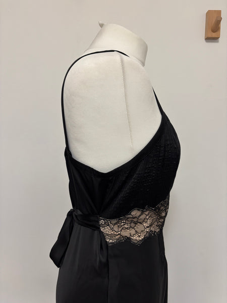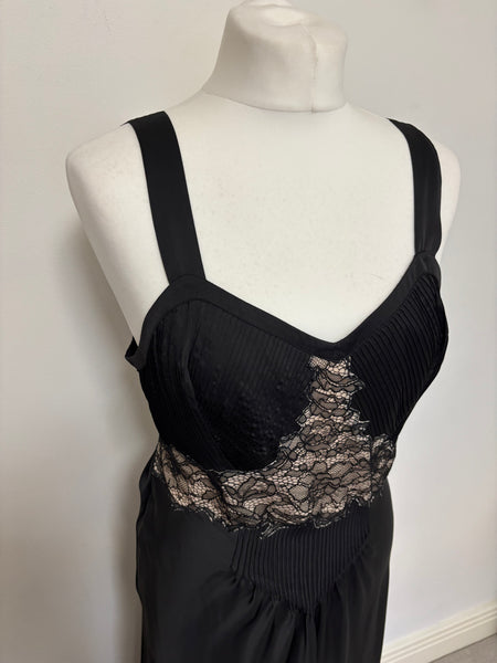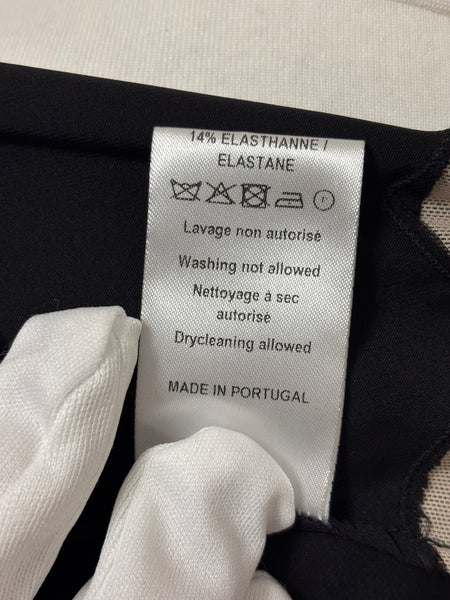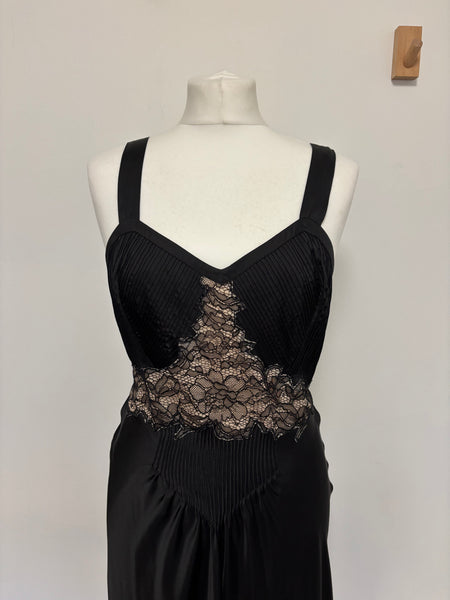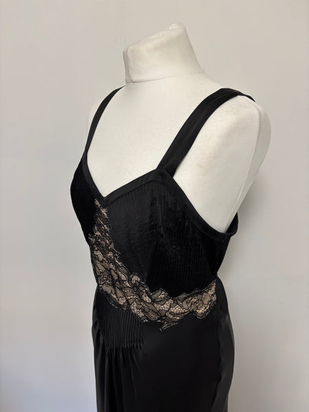 This Paco Rabanne gown embodies the avant-garde spirit of the brand. The design pairs a sculpted, pleated bodice with wide straps for structure, contrasted beautifully by an intricate nude lace panel that creates a striking focal point at the waist. The fluid skirt falls gracefully to the floor, lending softness to the otherwise architectural lines.