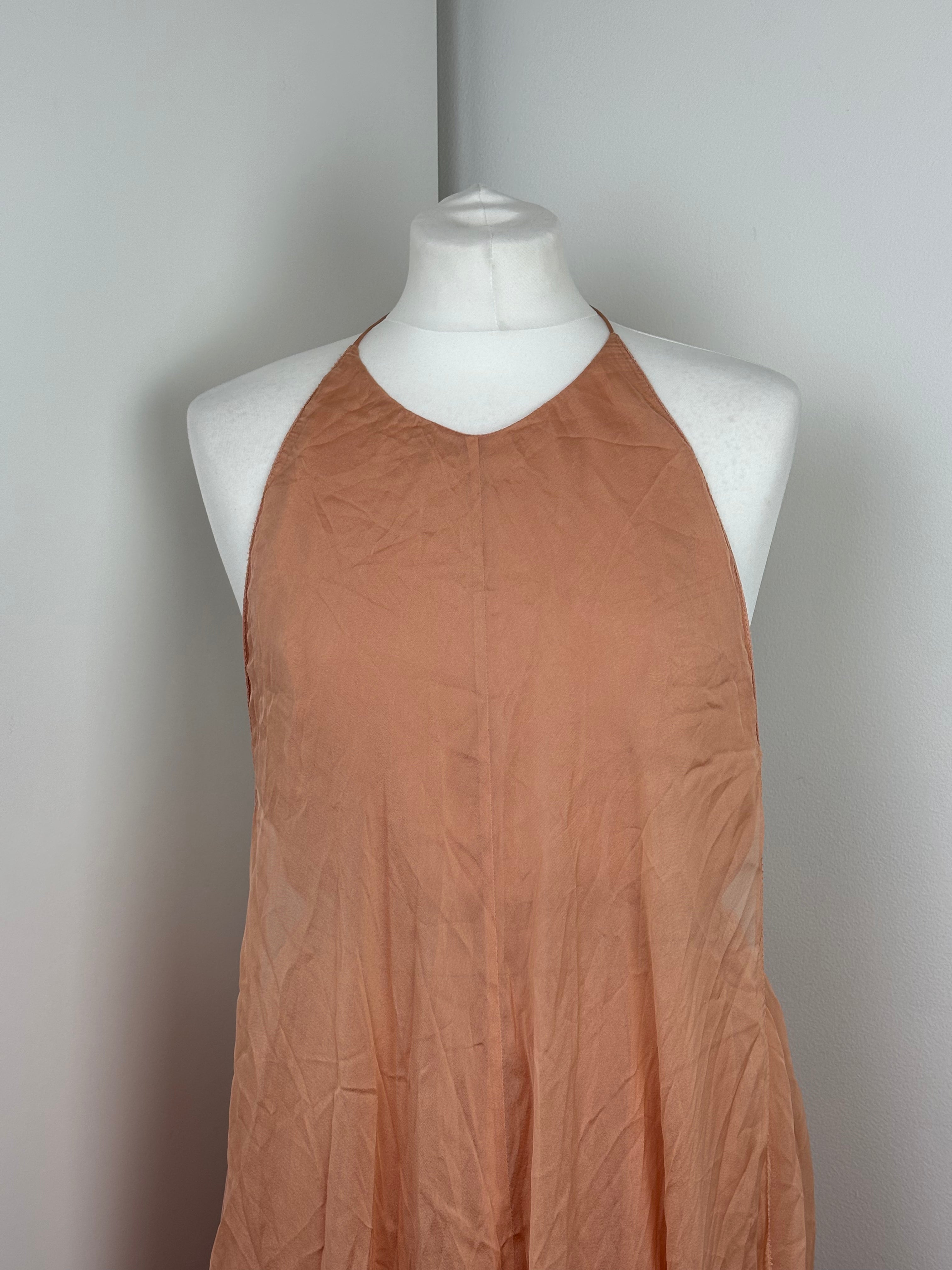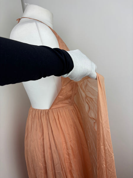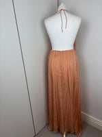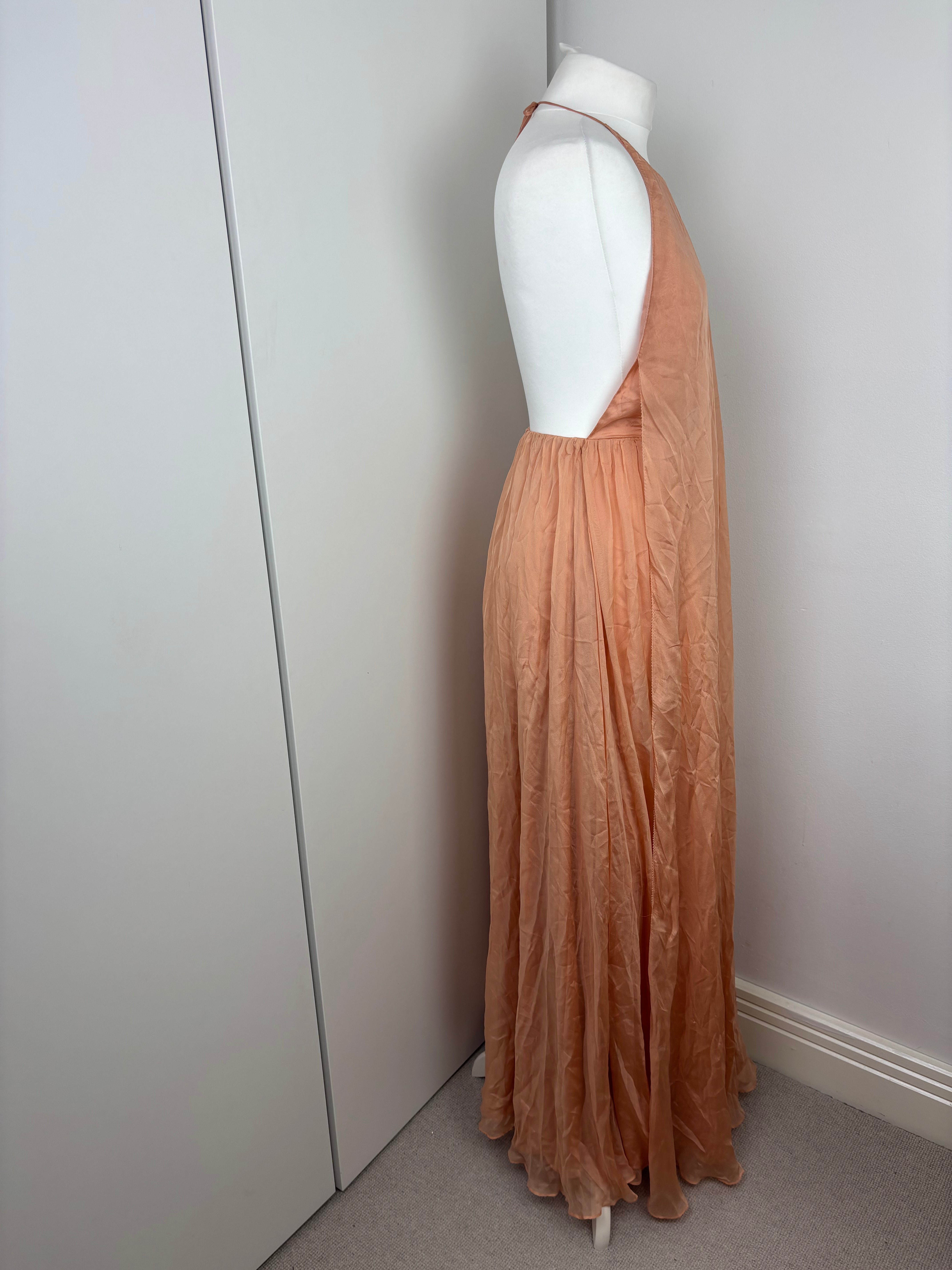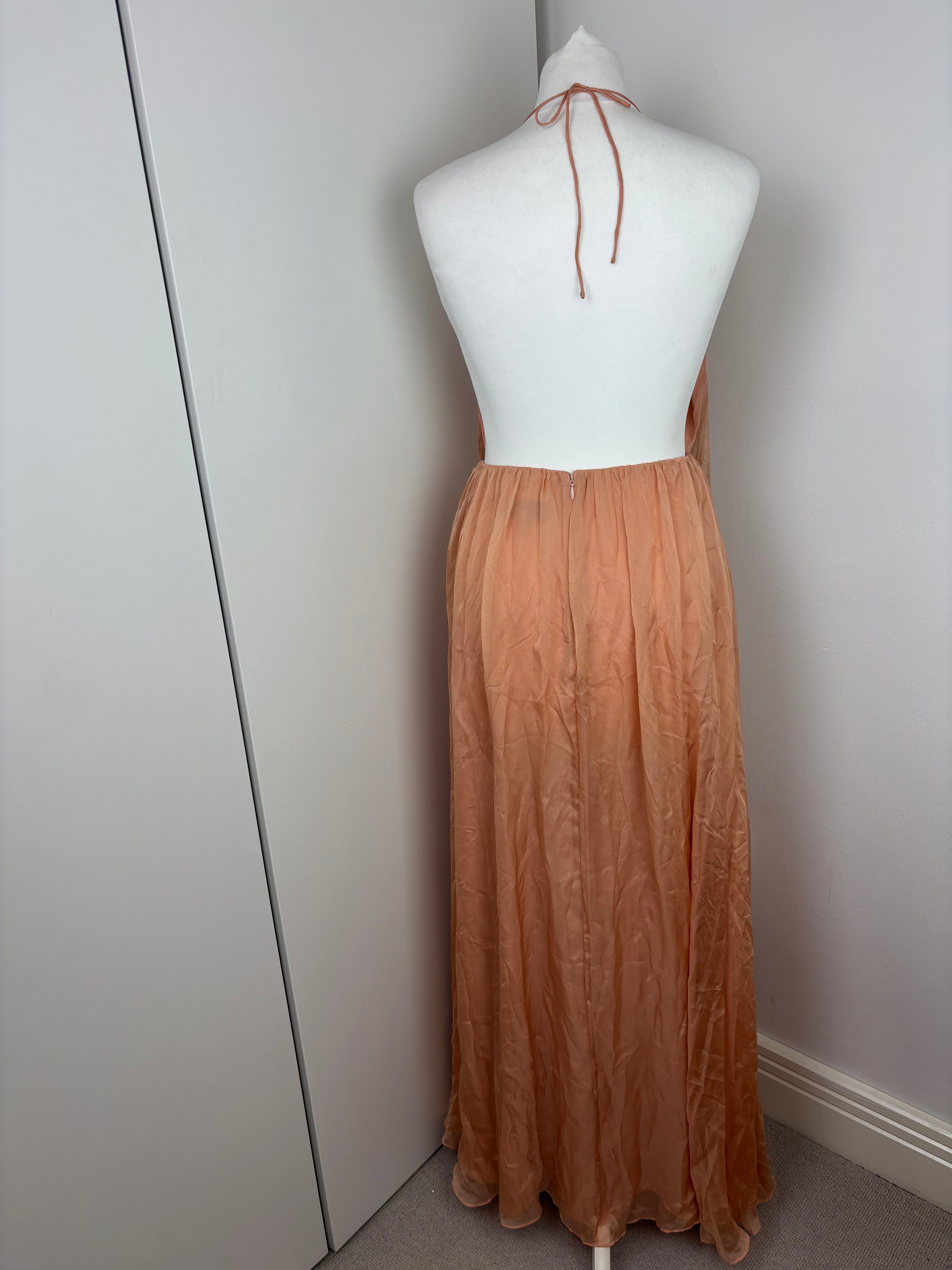 Luxurious Reiss peach maxi dress in 100% silk. Its design and fabric come together in an elegant, fresh, summery style. Ideal for special occasions, it is a halter dress, with a deep open back cut. Finished with an extra layer on the front that brings movement to the dress.