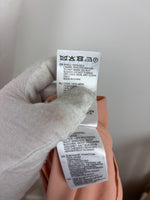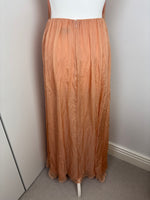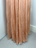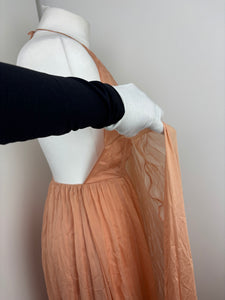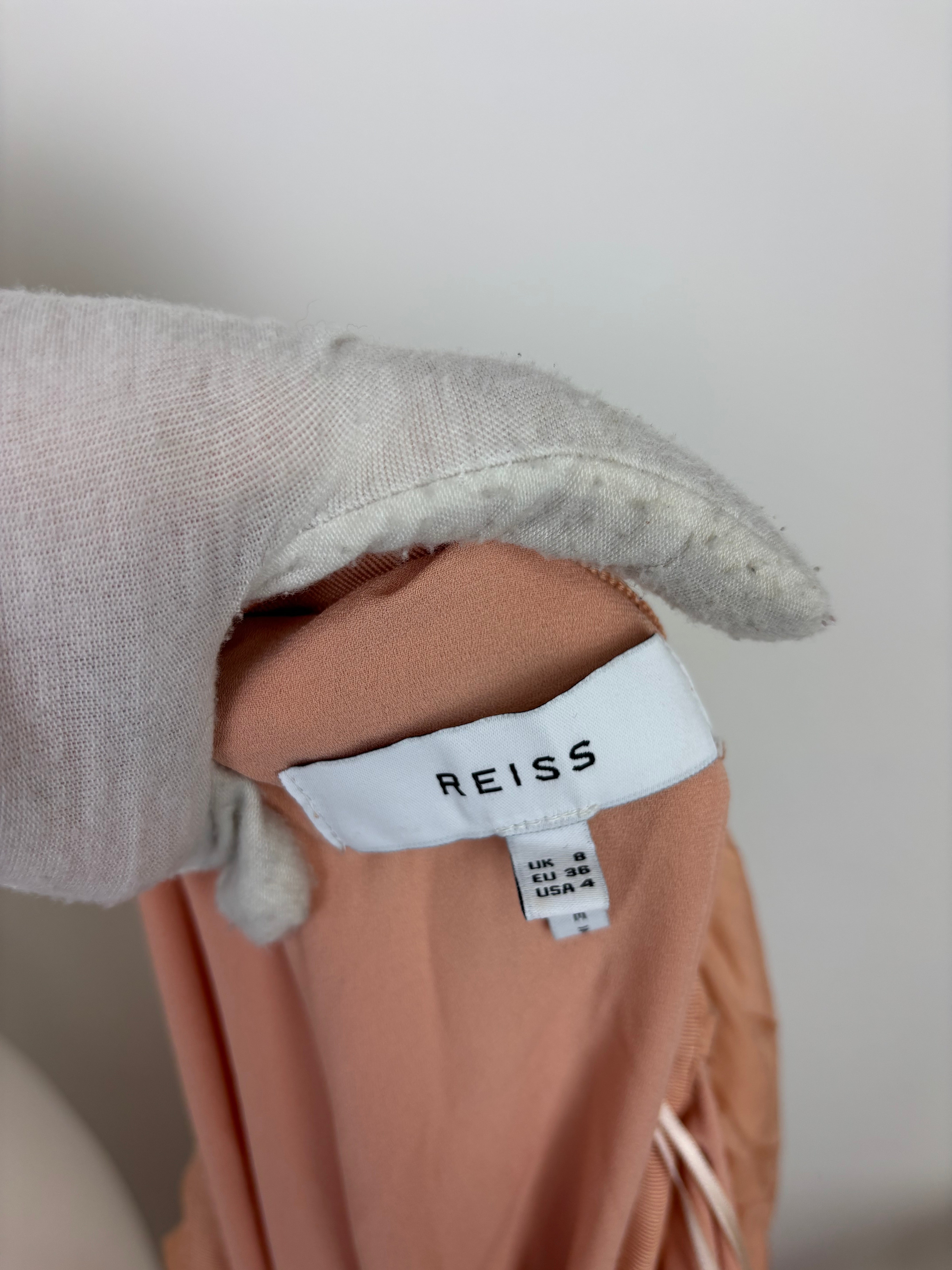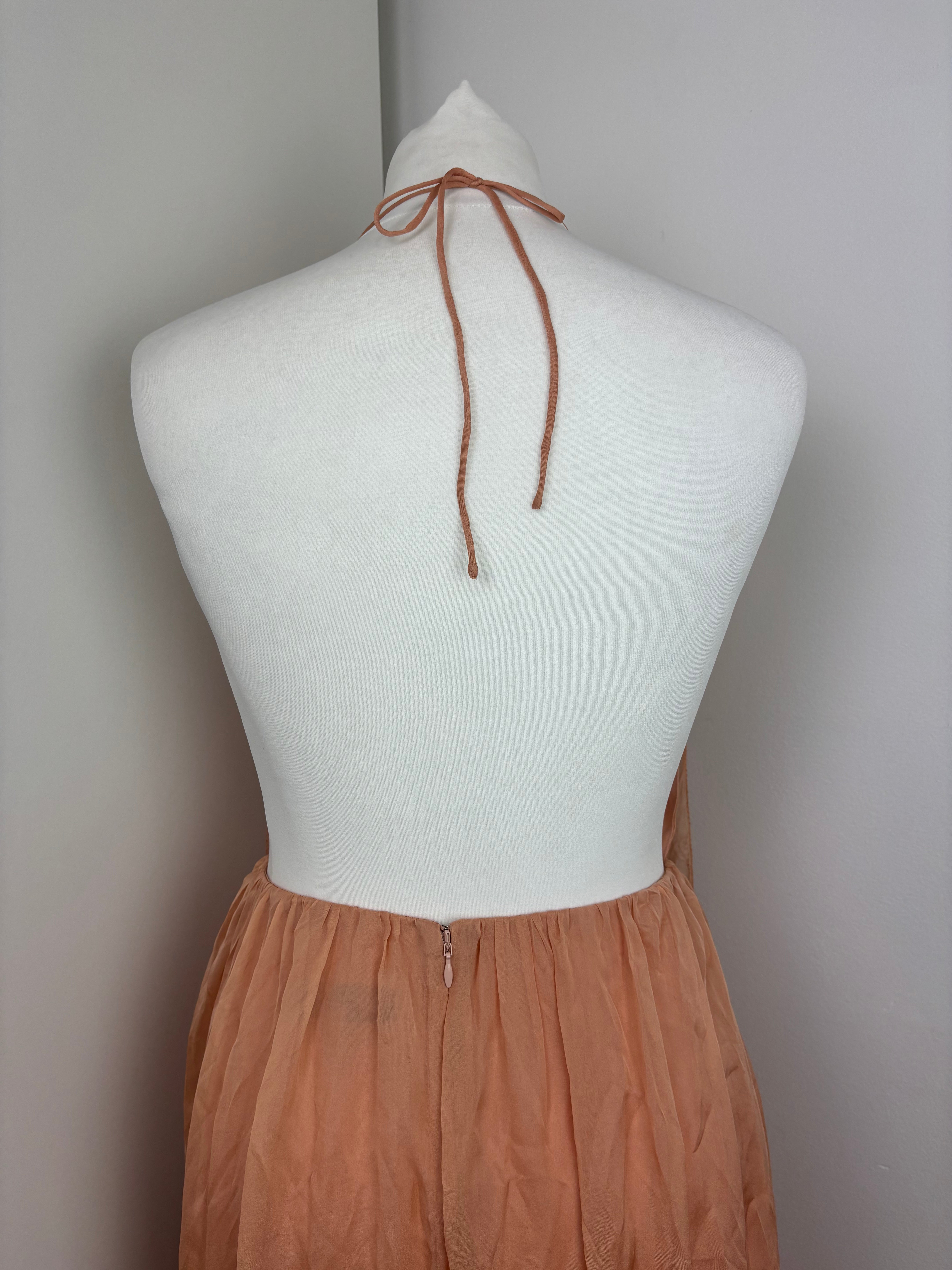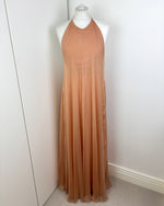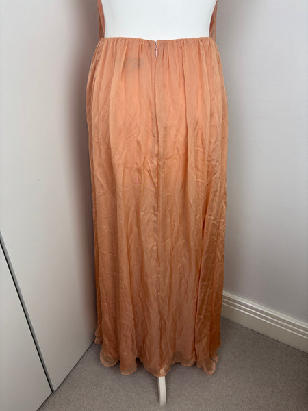 Luxurious Reiss peach maxi dress in 100% silk. Its design and fabric come together in an elegant, fresh, summery style. Ideal for special occasions, it is a halter dress, with a deep open back cut. Finished with an extra layer on the front that brings movement to the dress.