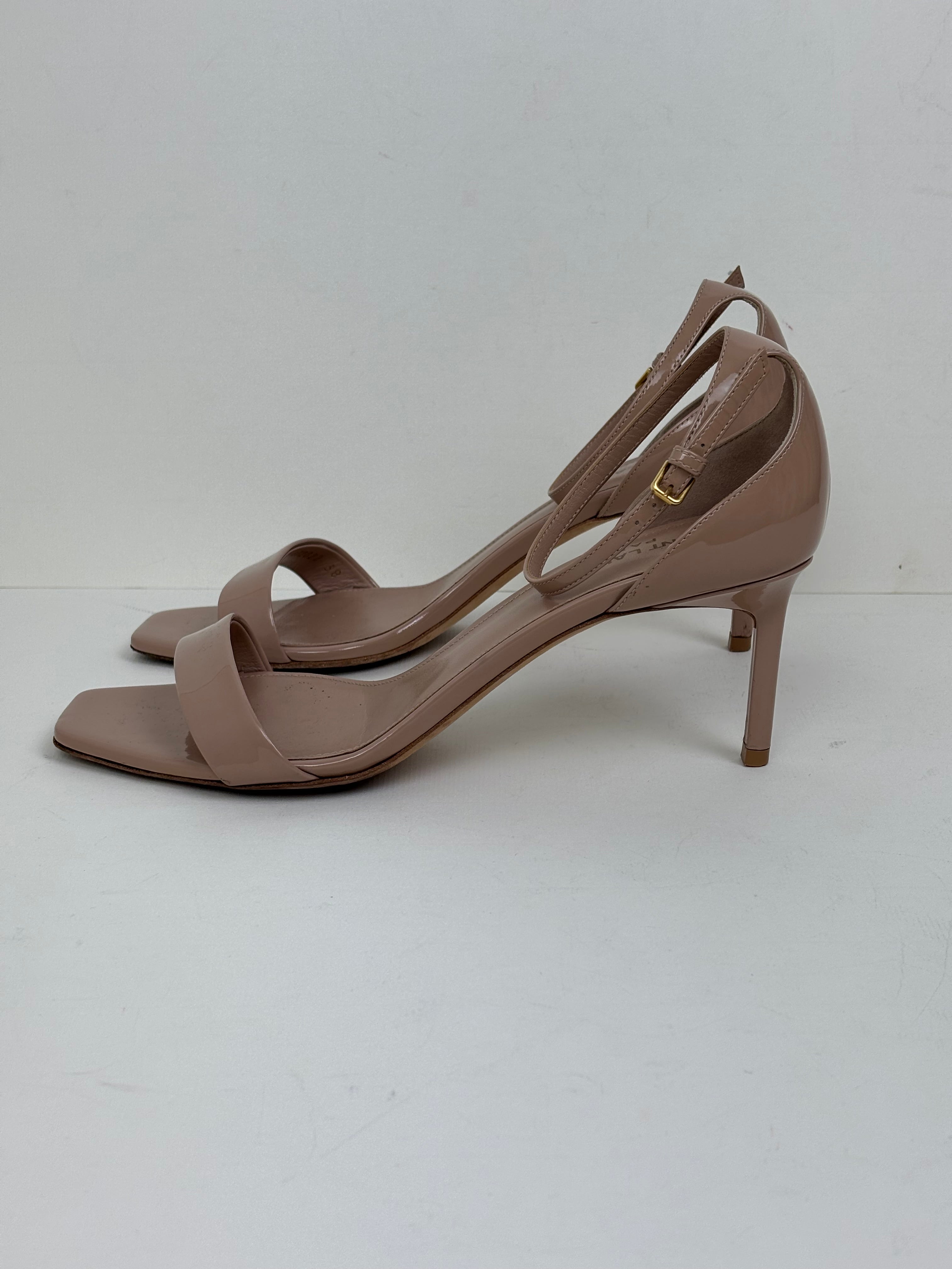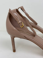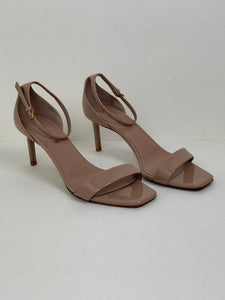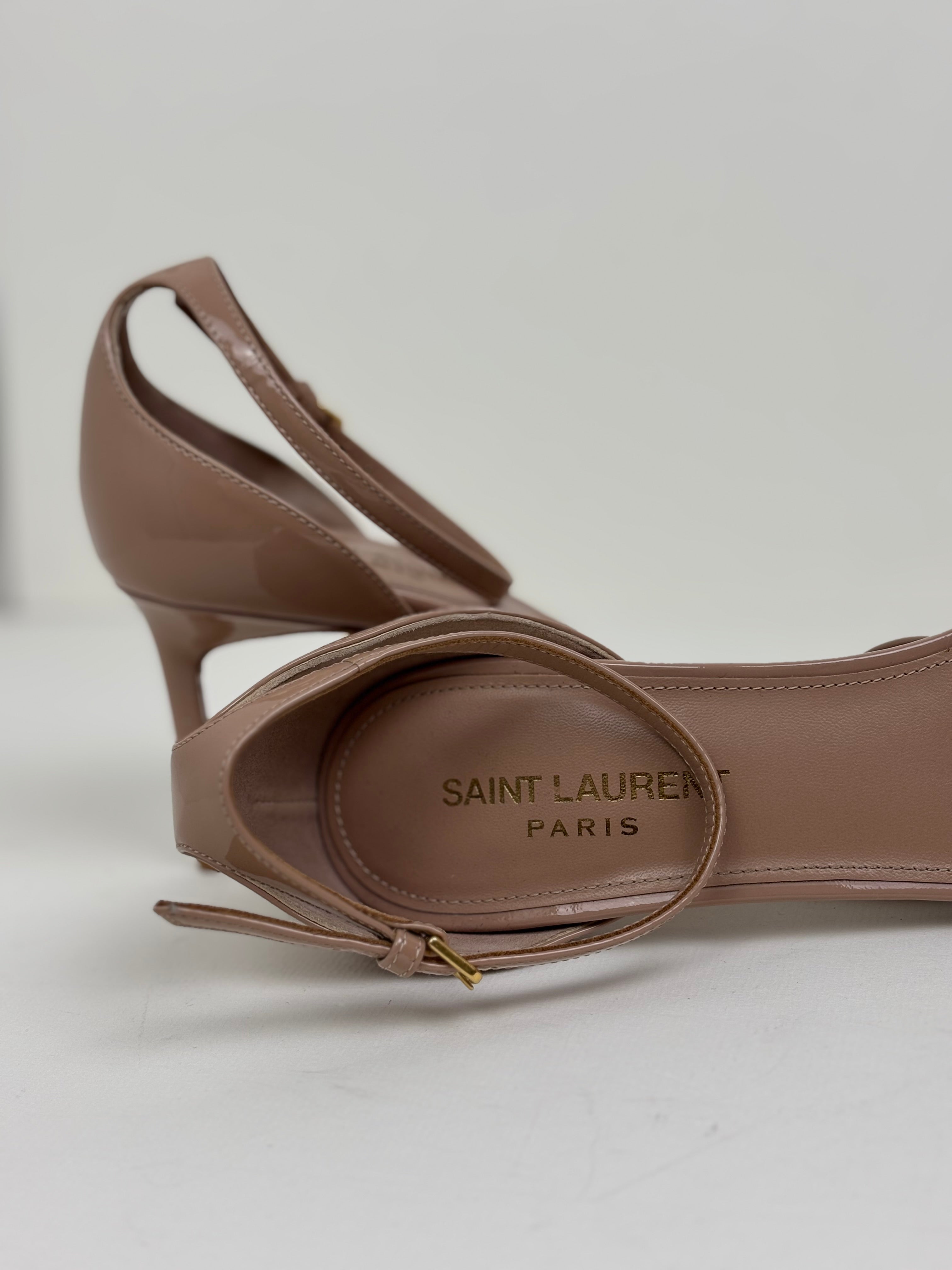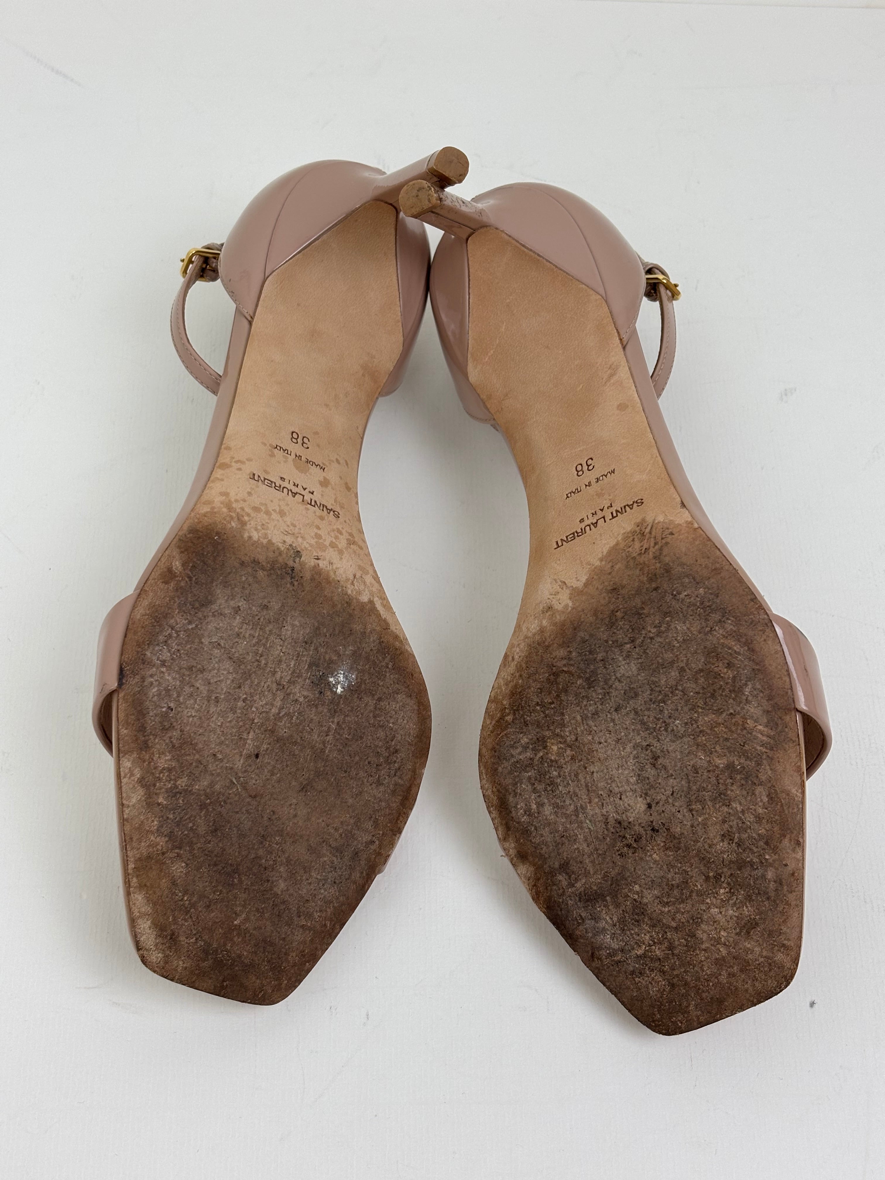Minimalist nude sandals by Saint Laurent, featuring a glossy patent leather finish, square toe, and a wide front strap. A delicate ankle strap with gold-tone buckle closure adds refinement and stability. Set on a sleek mid-height stiletto heel, this versatile design blends modern elegance with timeless appeal.
