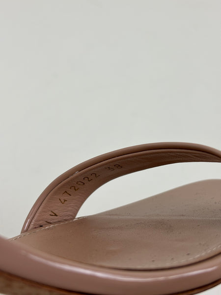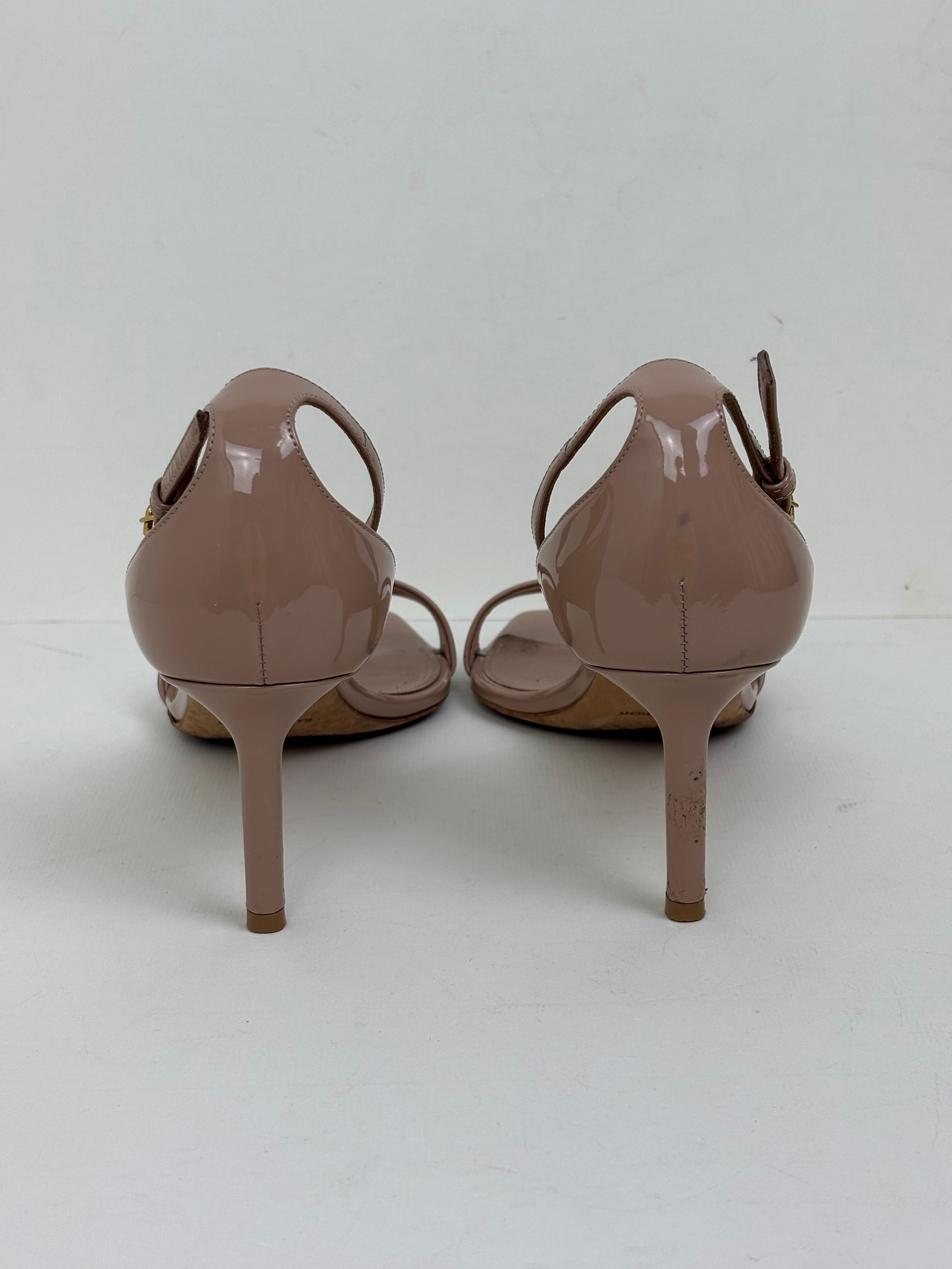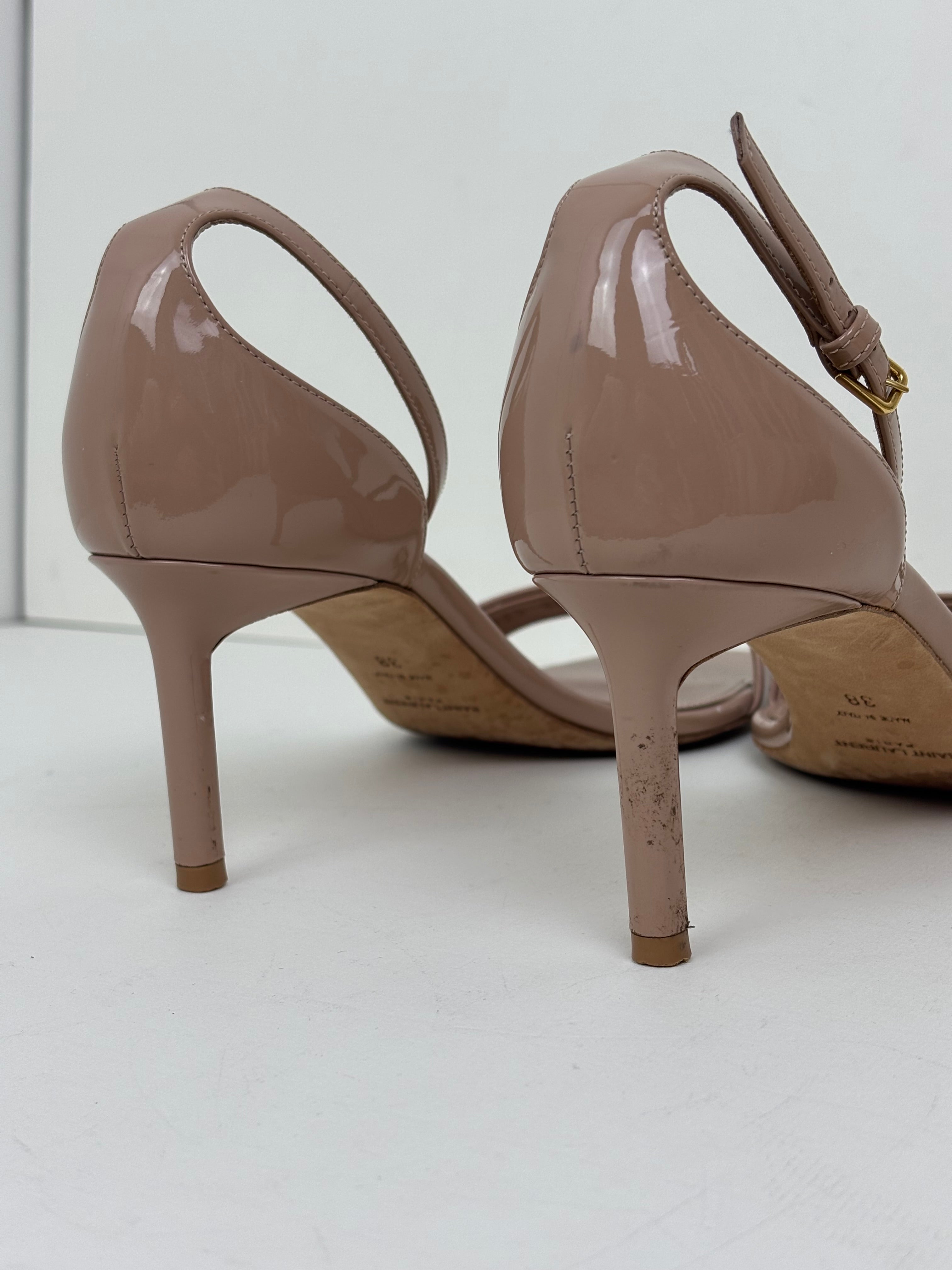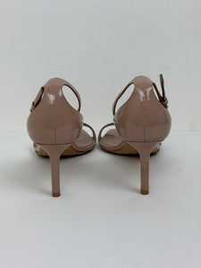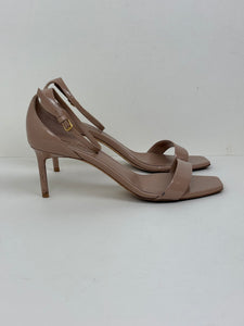 Minimalist nude sandals by Saint Laurent, featuring a glossy patent leather finish, square toe, and a wide front strap. A delicate ankle strap with gold-tone buckle closure adds refinement and stability. Set on a sleek mid-height stiletto heel, this versatile design blends modern elegance with timeless appeal.