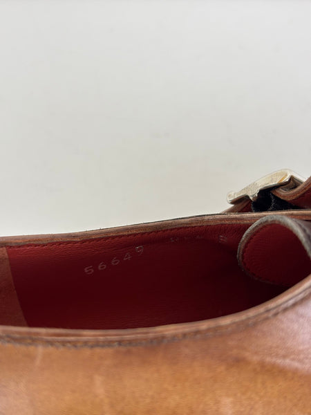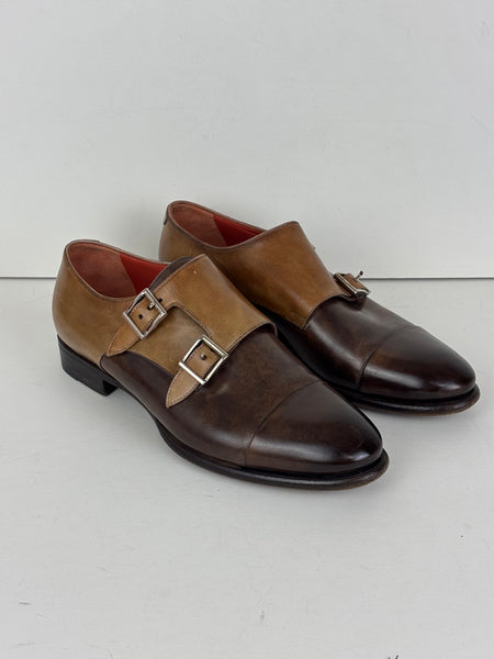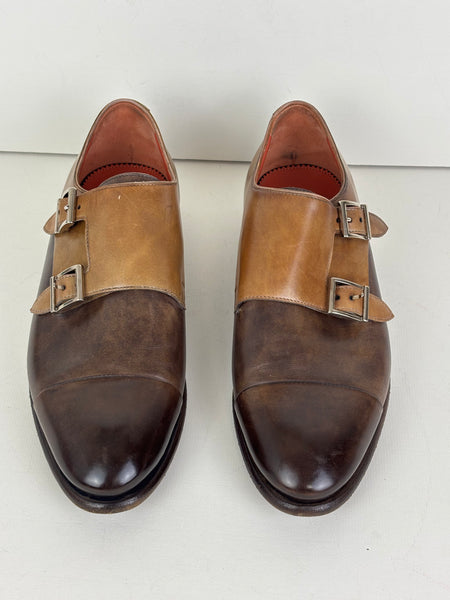 Exceptional Italian craftsmanship defines these Santoni double monk straps. They feature a sophisticated two-tone burnished leather finish, transitioning from a warm tan to a deep espresso brown. With their sleek almond toe and polished silver buckles, these are the ultimate choice for the modern ladies seeking timeless elegance.