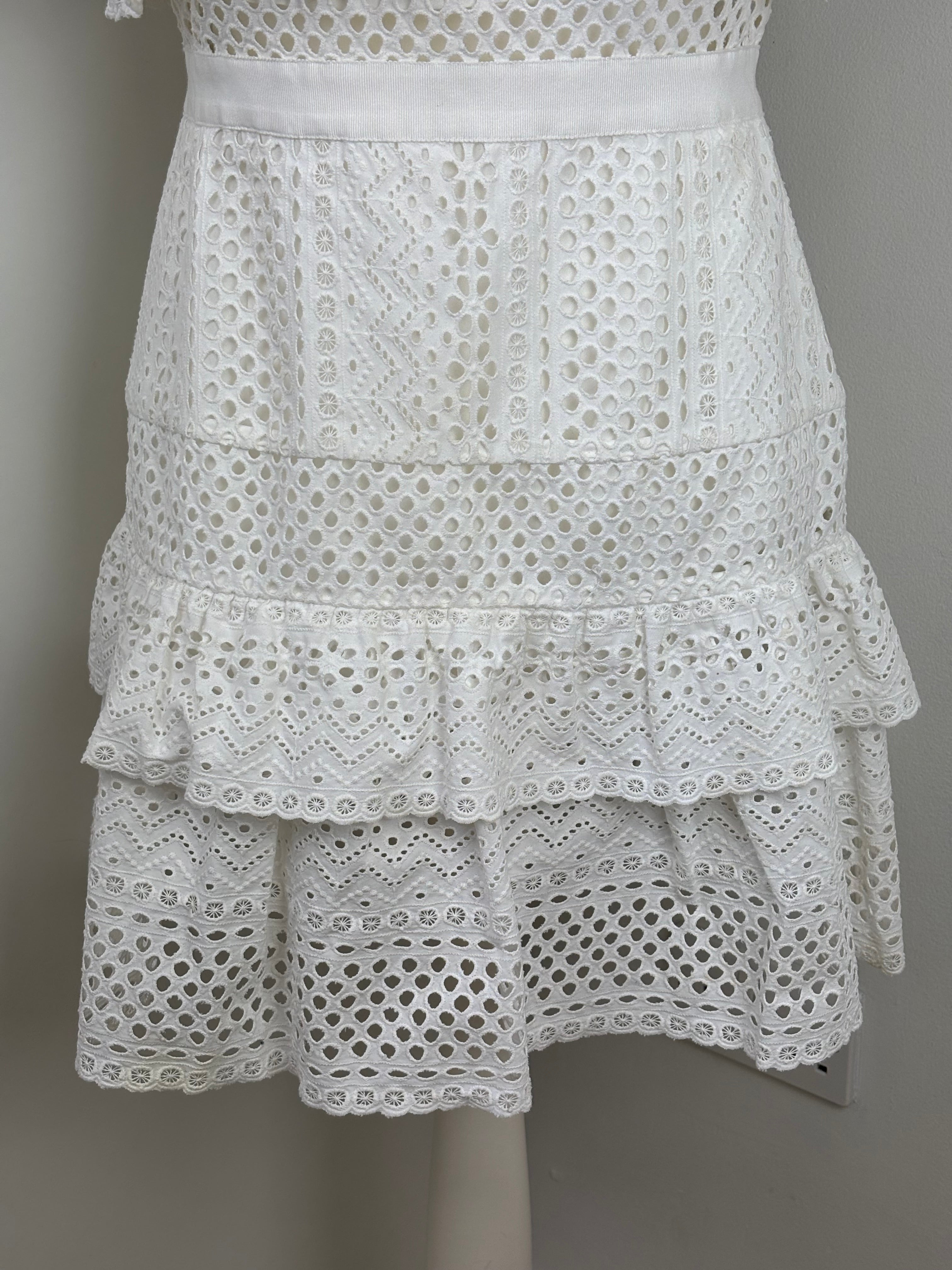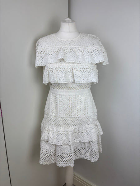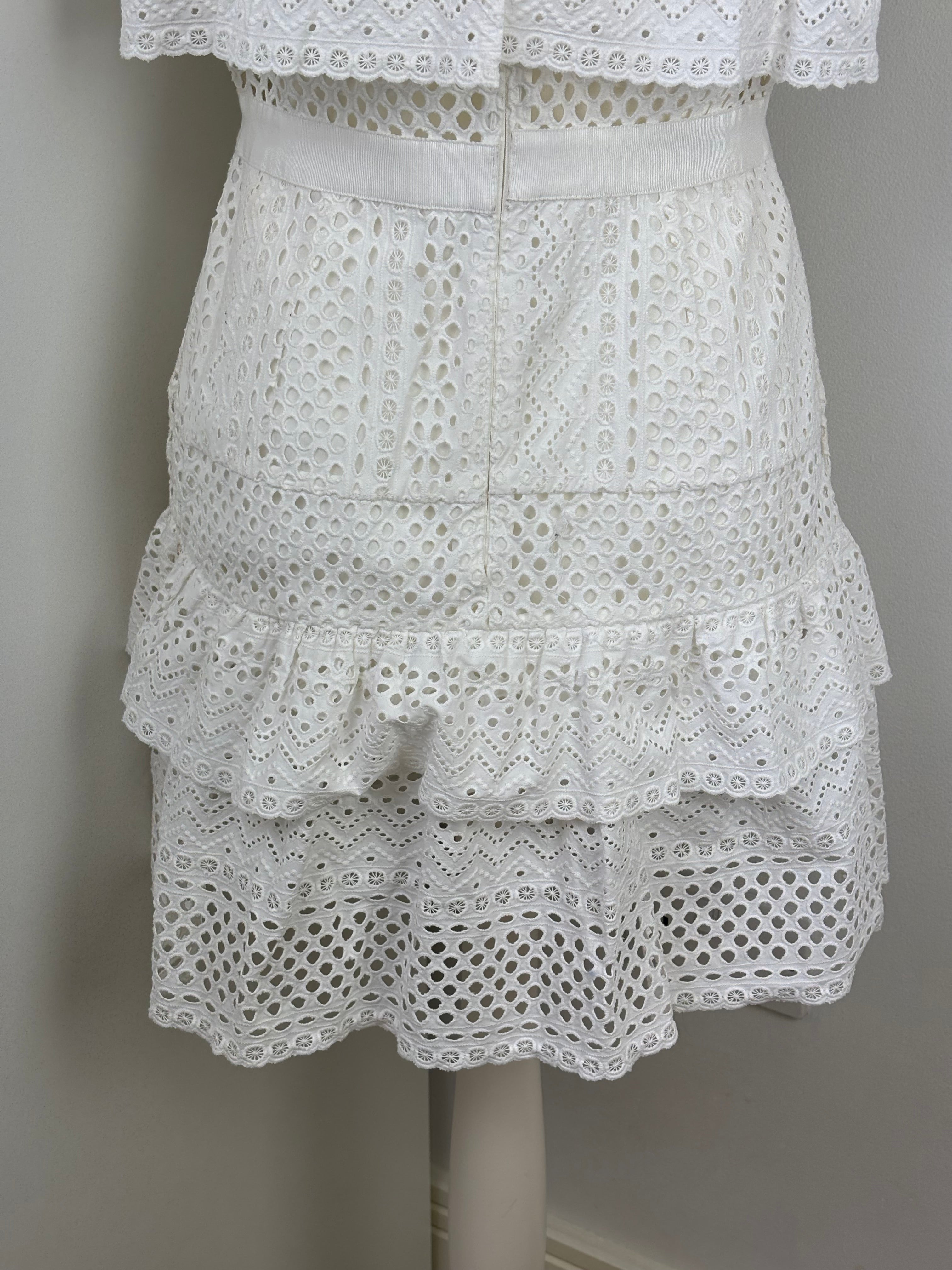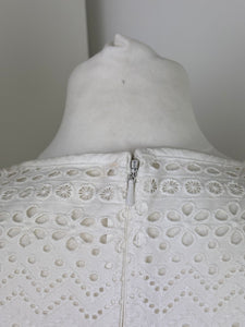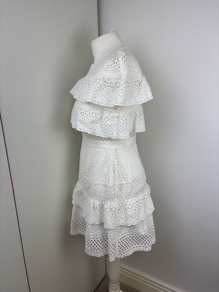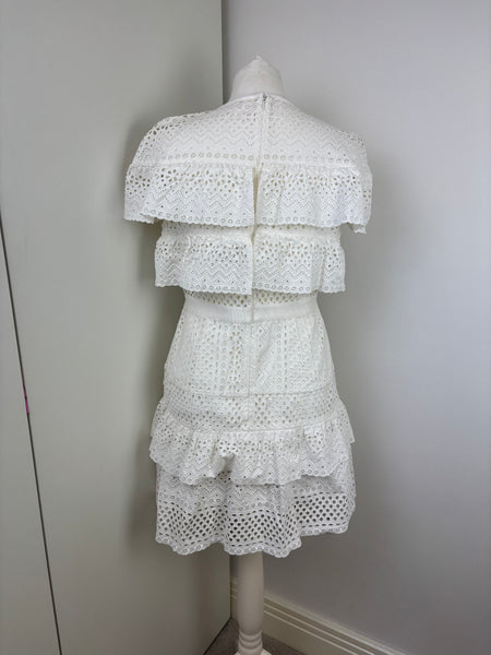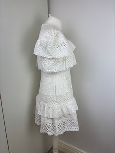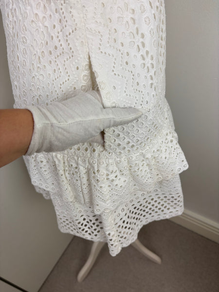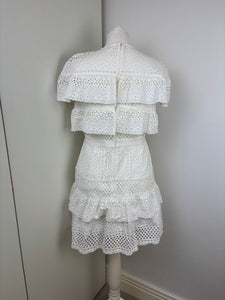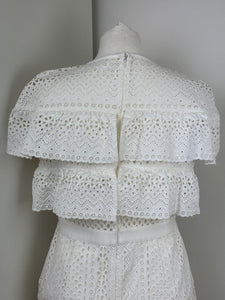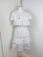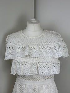 A dreamy, feminine Midi dress made from crisp white lace and eyelet panels. Its fit-and-flare design, sweetheart neckline and tiered skirt evoke classic elegance with a modern twist—ideal for beach escapes or summer events.
