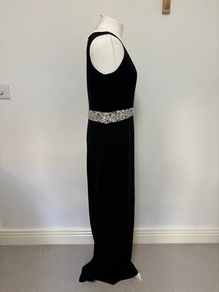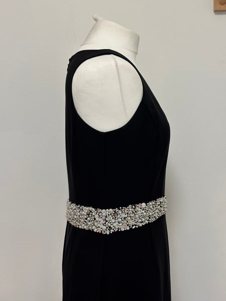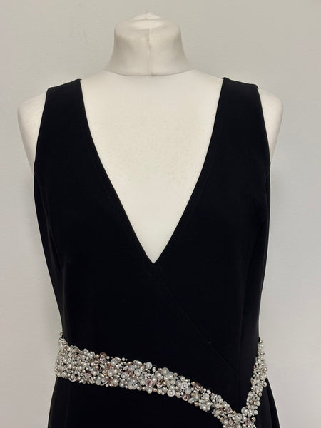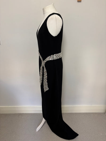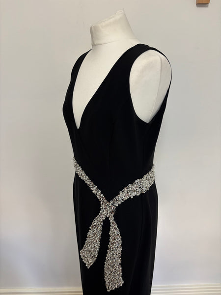 This St. John Couture’s gown is defined by its sleek, floor-skimming silhouette and deep V-neckline. The standout feature is the meticulously hand-embellished crystal belt that wraps around the waist and falls into a dramatic, fluid tie detail at the hip. Elegant and understated with an irresistible hint of glamour.