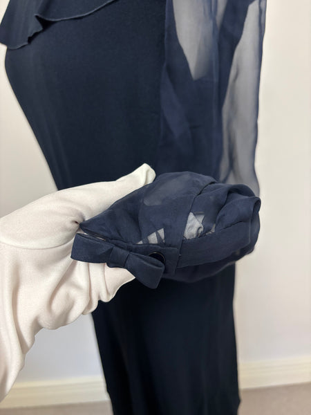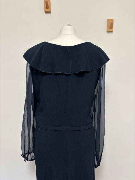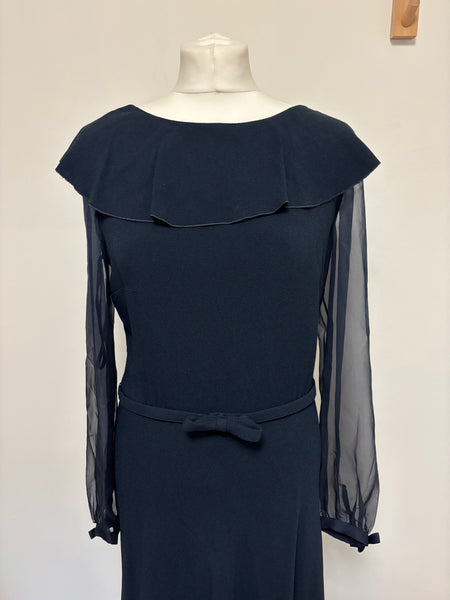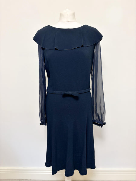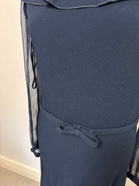 This elegant navy blue Valentino dress exudes timeless sophistication. With a classic design, it features a bateau neckline and a charming ruffled overlay that creates a delicate and romantic look. The long sleeves, made of a translucent fabric, add a touch of lightness and mystery. The piece is finished with a waistband that can be tied into a bow.